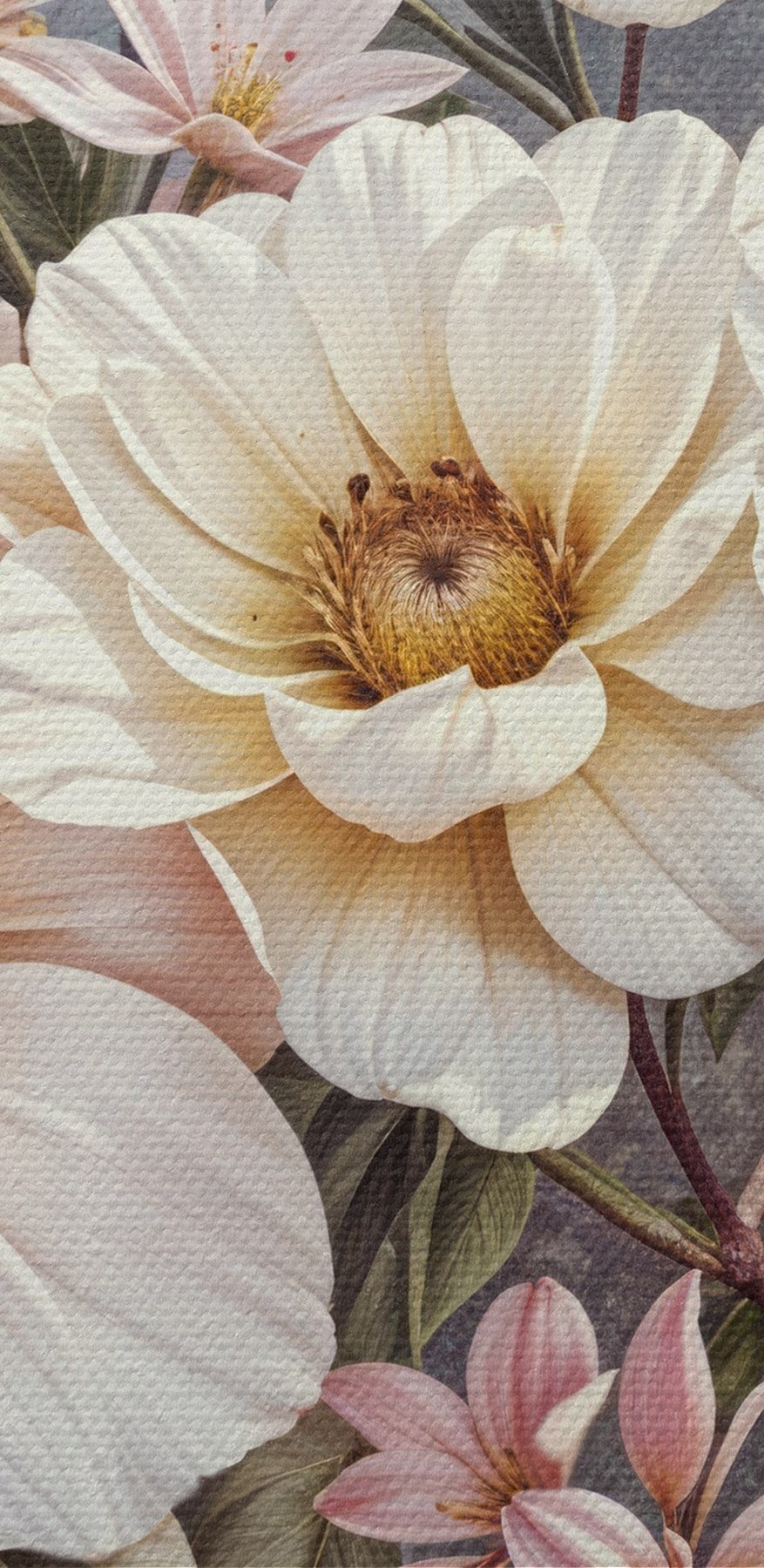 Dieser bezaubernde Leinwanddruck mit einer Gruppe weißer Blumen verwandelt Ihren Raum. Es ist, als hätten Sie ein kleines Stück Natur direkt in Ihrem Zuhause – ohne die lästigen Pollen! Stellen Sie sich vor, Sie wachen jeden Morgen mit diesen Blüten auf und ihre Eleganz erhellt Ihren Tag. Die sanften Farben und filigranen Details verleihen jedem Raum Wärme und machen ihn sofort gemütlicher. Vielleicht kommen sogar Freunde vorbei, um Ihren Geschmack zu bewundern! Egal, ob es über einem Sofa hängt oder einen Flur erhellt, dieses Kunstwerk strahlt eine sanfte Atmosphäre aus, der man nur schwer widerstehen kann. Perfekt für Blumenliebhaber oder alle, die ein bisschen Natur in ihre Einrichtung bringen wollen!
