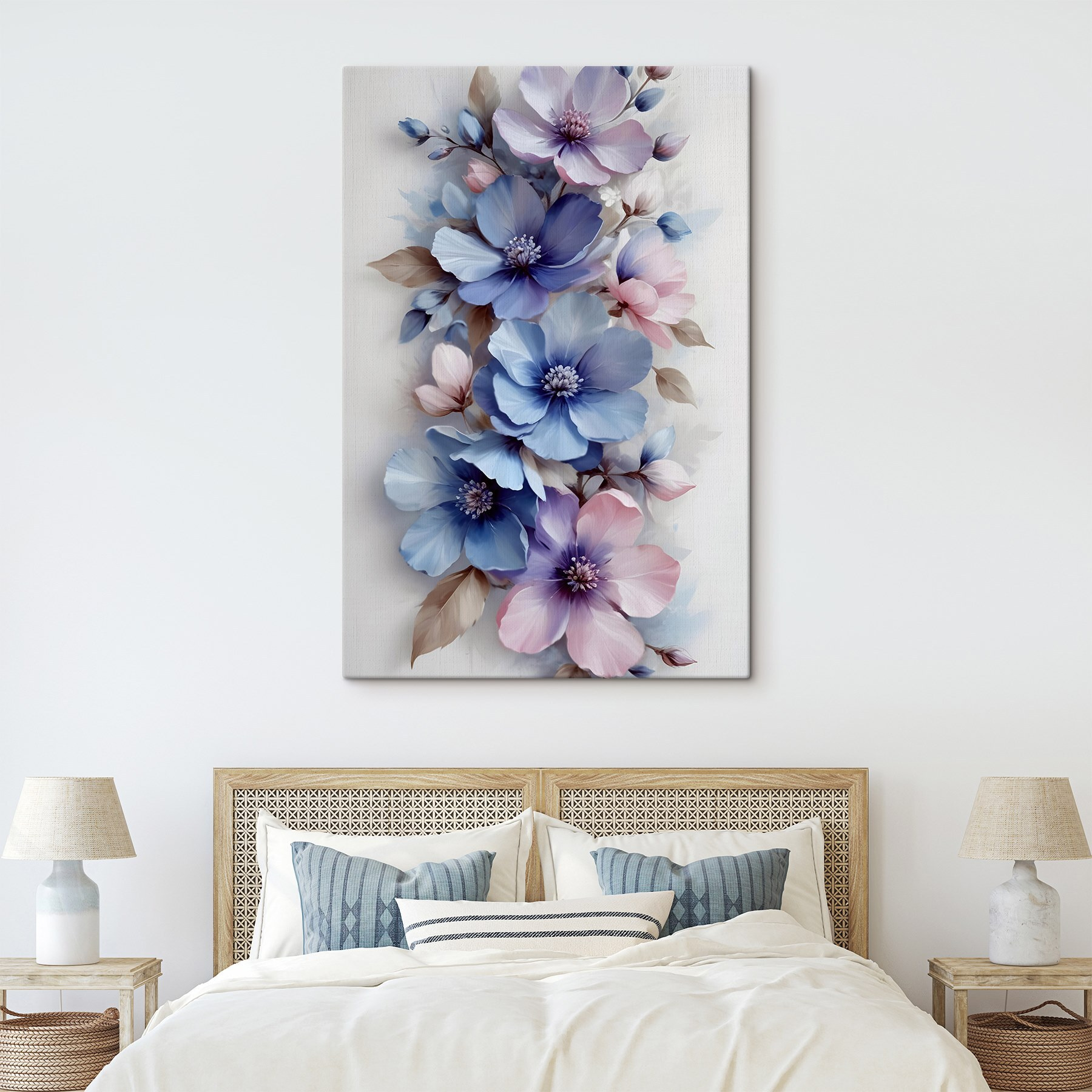 Verschönern Sie jeden Raum mit “Delicate Blooms in Soft Hues”. Dieser Leinwanddruck fängt den wunderlichen Tanz der Blumen in sanften Blau- und Rosatönen ein und ist perfekt, um einen Hauch von Natur ins Haus zu holen. Stellen Sie sich vor, Sie schlürfen Ihren Morgenkaffee, während Sie dieses reizende Werk betrachten – es ist, als hätten Sie eine Vase mit frischen Blüten, ohne sie gießen zu müssen! Jedes Blütenblatt scheint süße Töne zu flüstern und bringt Ruhe in den Raum. Ob im Wohnbereich oder im Schlafzimmer, es wird mit Sicherheit für Freude und Gesprächsstoff sorgen. Wer würde bei diesen Blüten nicht lächeln? Perfekt für Blumenliebhaber oder alle, die einen Hauch von Schönheit brauchen.