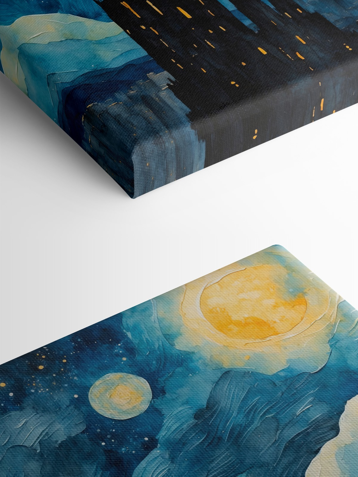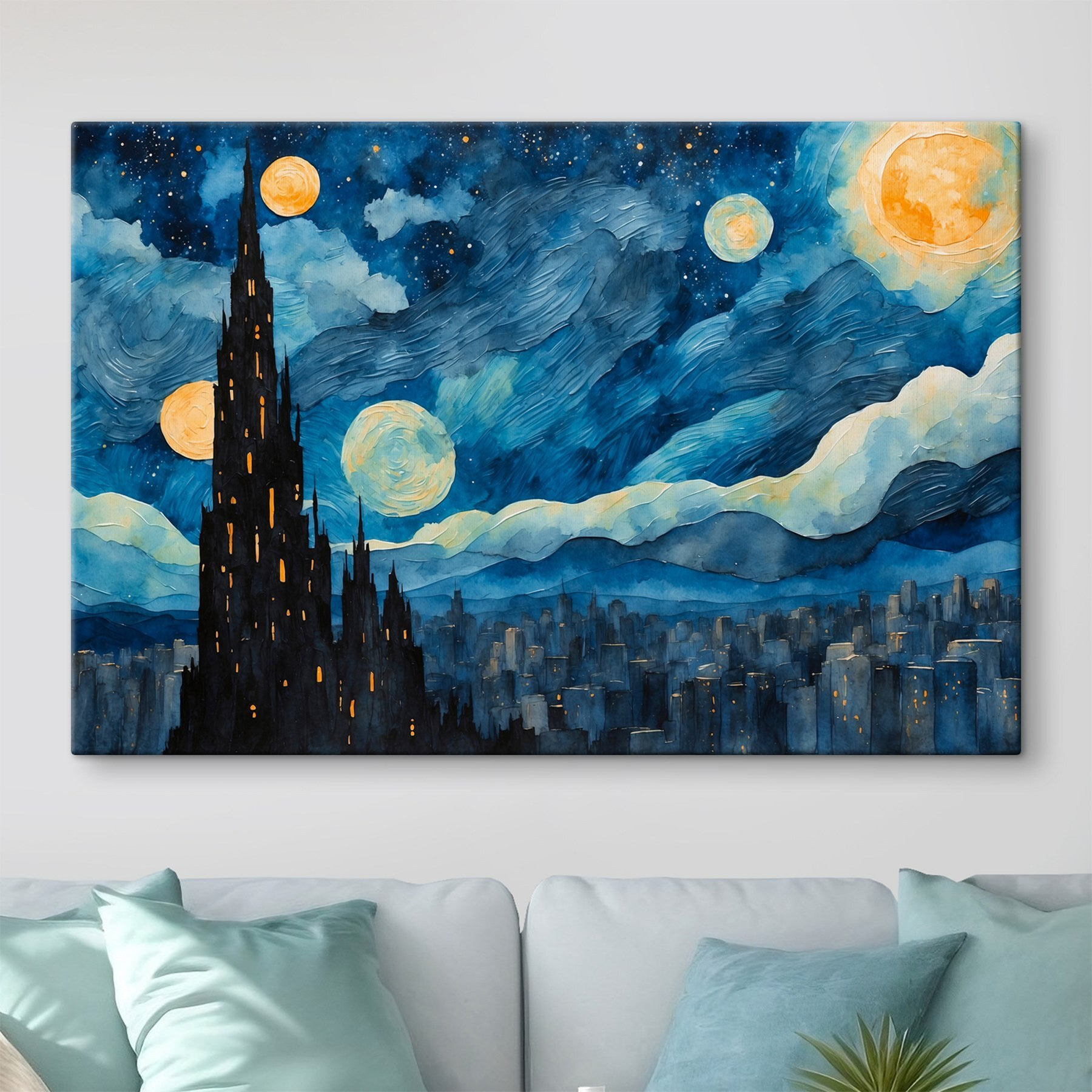 Verwandeln Sie eine trübe Wand in einen verträumten Rückzugsort mit diesem Aquarell einer nächtlichen Stadt auf Leinwand. Stellen Sie sich leuchtende Blautöne vor, die unter einem dunklen Himmel mit leuchtenden Monden, die Ihnen zuzuzwinkern scheinen, wirbeln. Die hoch aufragenden Türme erinnern an weit entfernte Städte und wecken vielleicht Erinnerungen an nächtliche Spaziergänge oder die Reise, von der Sie immer noch sprechen. Sie eignet sich perfekt, um Wohn- oder Schlafzimmern ein wenig Laune zu verleihen und lädt zu Tagträumen oder tiefgründigen Gesprächen ein. Wer würde dieses Stück nicht gerne betrachten, während er einen Tee oder Kaffee trinkt? Es ist, als würde man sich ein Stückchen Kosmos nach Hause holen – geheimnisvoll und doch gemütlich!