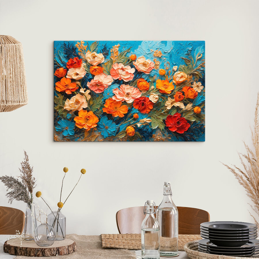Stellen Sie sich vor, Sie betreten einen Raum und werden von einer bunten Blütenpracht begrüßt – dieser Leinwanddruck mit Blumen auf einem leuchtend blauen Hintergrund tut genau das! Es ist, als ob ein Frühlingsgarten seinen Weg ins Haus gefunden hätte und jeden, der vorbeischlendert, mit einem fröhlichen Nicken begrüßt. Jede Blume scheint mit ihren satten Farben, die sich lebendig anfühlen, direkt aus der Leinwand herauszukommen. Man kann die frischen Blütenblätter fast riechen, nicht wahr? Perfekt, um trübe Ecken aufzuhellen oder einen Farbtupfer in einen entspannten Raum zu bringen. Es ist, als hätte man die Freude der Natur an der Wand hängen – kein Gießen erforderlich! Und vielleicht inspiriert es ja auch jemanden dazu, echte Blumen mit nach Hause zu bringen. Also, wer braucht schon einen grünen Daumen? Schnappen Sie sich einfach diese Schönheit und lassen Sie sie blühen!