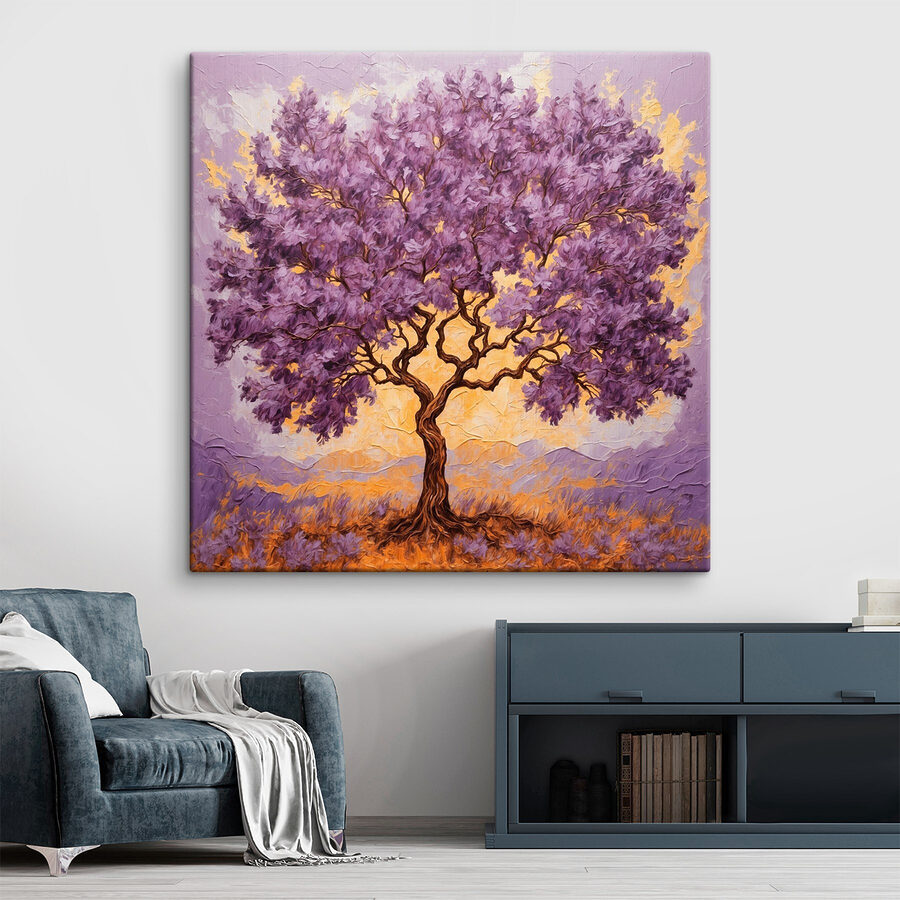Dieses auffällige Leinwandbild eines Baumes mit leuchtend lila Blättern bringt frischen Wind in Ihre Räume. Es ist eine reizvolle Mischung aus der Schönheit der Natur und einem Hauch von Laune, perfekt für alle, die ihren Wänden einen Hauch von Außergewöhnlichkeit verleihen möchten. Stellen Sie sich vor, Sie gehen täglich daran vorbei und spüren jedes Mal einen kleinen Funken der Freude. Die reiche Textur und die beruhigenden Farben können jeden Raum verwandeln und eine heitere Atmosphäre schaffen, die jeden willkommen heißt, der eintritt. Es ist wie ein Mini-Urlaub in Ihrem eigenen Haus. Sie müssen nicht in den Urlaub fahren, wenn Sie sich in dieses atemberaubende Kunstwerk flüchten können! Perfekt für gemütliche Kaffeekränzchen oder zur Anregung kreativer Gedanken. Wie kann etwas so Einfaches so viel Wärme ausstrahlen? Es ist magisch.