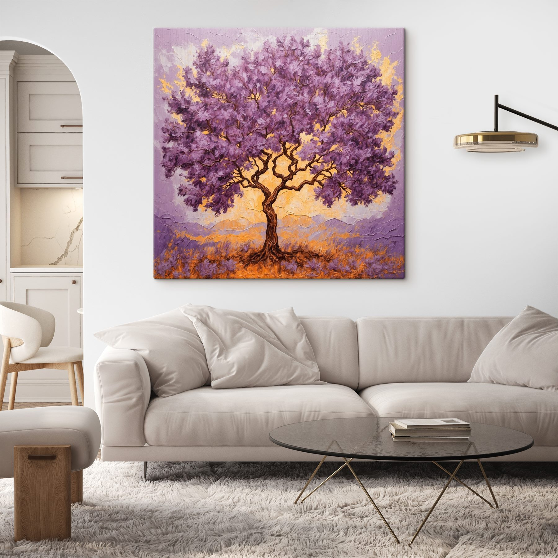 Dieses auffällige Leinwandbild eines Baumes mit leuchtend lila Blättern bringt frischen Wind in Ihre Räume. Es ist eine reizvolle Mischung aus der Schönheit der Natur und einem Hauch von Laune, perfekt für alle, die ihren Wänden einen Hauch von Außergewöhnlichkeit verleihen möchten. Stellen Sie sich vor, Sie gehen täglich daran vorbei und spüren jedes Mal einen kleinen Funken der Freude. Die reiche Textur und die beruhigenden Farben können jeden Raum verwandeln und eine heitere Atmosphäre schaffen, die jeden willkommen heißt, der eintritt. Es ist wie ein Mini-Urlaub in Ihrem eigenen Haus. Sie müssen nicht in den Urlaub fahren, wenn Sie sich in dieses atemberaubende Kunstwerk flüchten können! Perfekt für gemütliche Kaffeekränzchen oder zur Anregung kreativer Gedanken. Wie kann etwas so Einfaches so viel Wärme ausstrahlen? Es ist magisch.