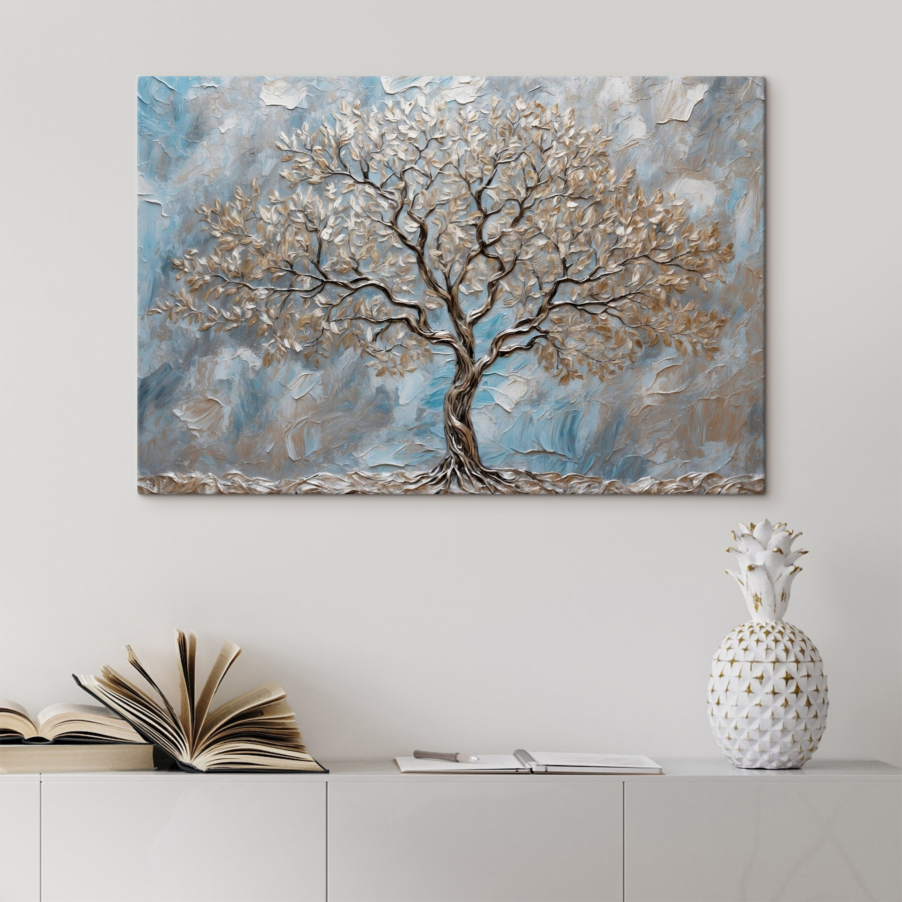 Verwandeln Sie jede Wand in einen ruhigen Rückzugsort mit diesem atemberaubenden Leinwanddruck eines majestätischen Baumes. Die beruhigenden Blautöne und reichhaltigen Texturen flüstern von sanften Brisen und ruhigen Momenten zwischen den Ästen. Stellen Sie sich vor, Sie kommen nach einem langen Tag in den Raum und werden von diesem Bild begrüßt – es ist wie ein Mini-Urlaub, ohne das Haus zu verlassen!