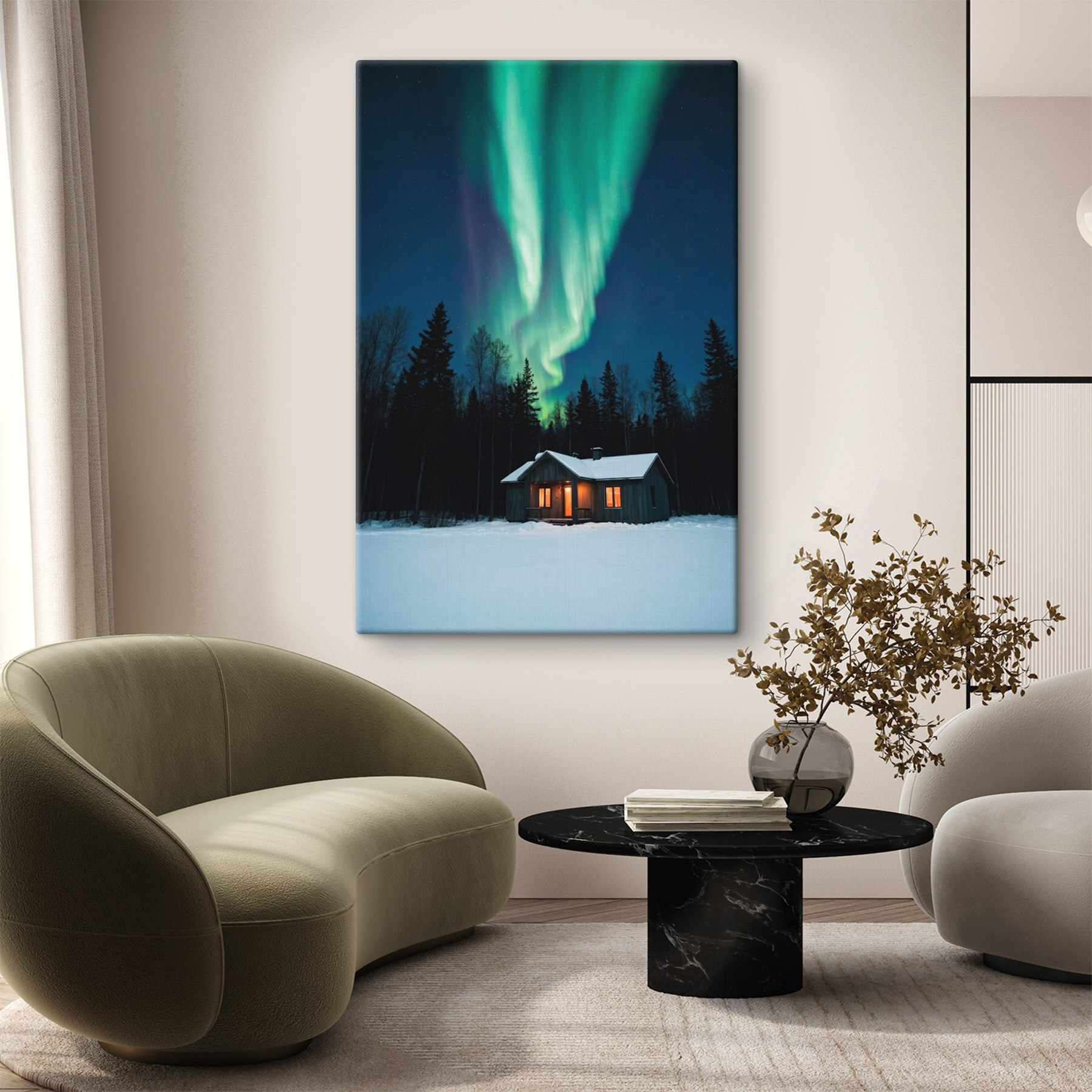 Stellen Sie sich vor, Sie machen es sich in einer warmen Holzhütte gemütlich, während die Welt draußen in eine Schneedecke gehüllt ist. Dieser atemberaubende Leinwanddruck fängt diese perfekte Winternacht mit dem magischen Tanz der grünen Lichter am Himmel ein. Es ist wie die eigene Lichtshow der Natur, direkt über Ihrem verträumten Rückzugsort. Ob am knisternden Kaminfeuer oder beim Schlürfen eines heißen Kakaos, dieses Kunstwerk bringt diese gemütlichen Gefühle in jeden Raum. Es ist nicht nur eine Dekoration, sondern ein Stückchen Ruhe, das Geschichten von friedlichen Nächten und sternenklaren Träumen erzählt. Perfekt für alle, die der Hektik des Alltags ein wenig entfliehen wollen!