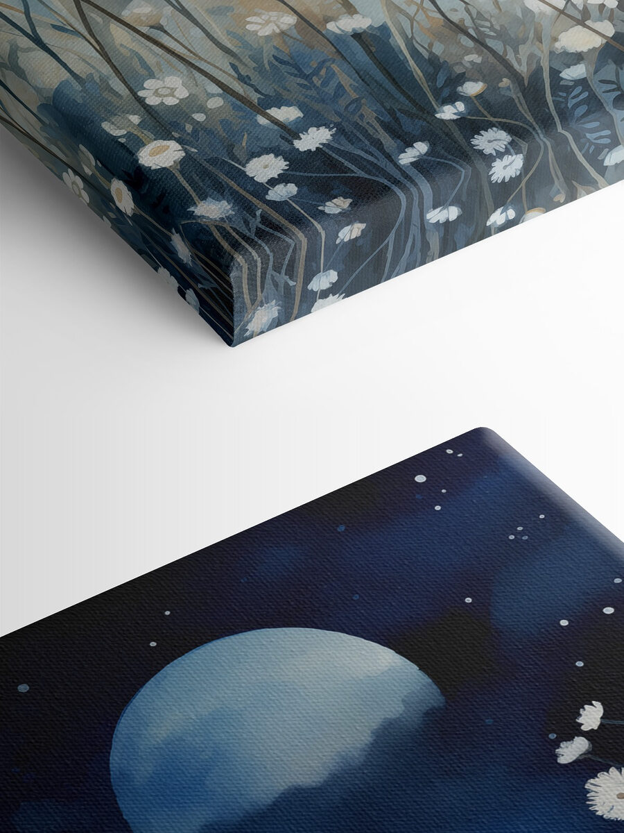Verwandeln Sie Ihren Raum mit diesem bezaubernden Leinwandbild mit weißen Blumen vor einem verträumten Nachthimmel. Stellen Sie sich vor, Sie spazieren durch einen mondbeschienenen Garten, in dem das sanfte Schwingen der Blütenblätter die Geheimnisse der Natur verrät. Diese zarten Blüten sind wie kleine Sterne, die über einen sanften blauen Hintergrund verstreut sind und ein Gefühl von Ruhe und Gelassenheit vermitteln. Dieses Kunstwerk eignet sich perfekt für eine gemütliche Leseecke oder als Blickfang im Wohnzimmer, da es sowohl Eleganz als auch Gelassenheit ausstrahlt. Lassen Sie sich jeden Tag zu süßen Tagträumen und einem Hauch von Magie der Natur inspirieren. Wer hätte gedacht, dass Blumen auf diese Weise das Rampenlicht stehlen können?