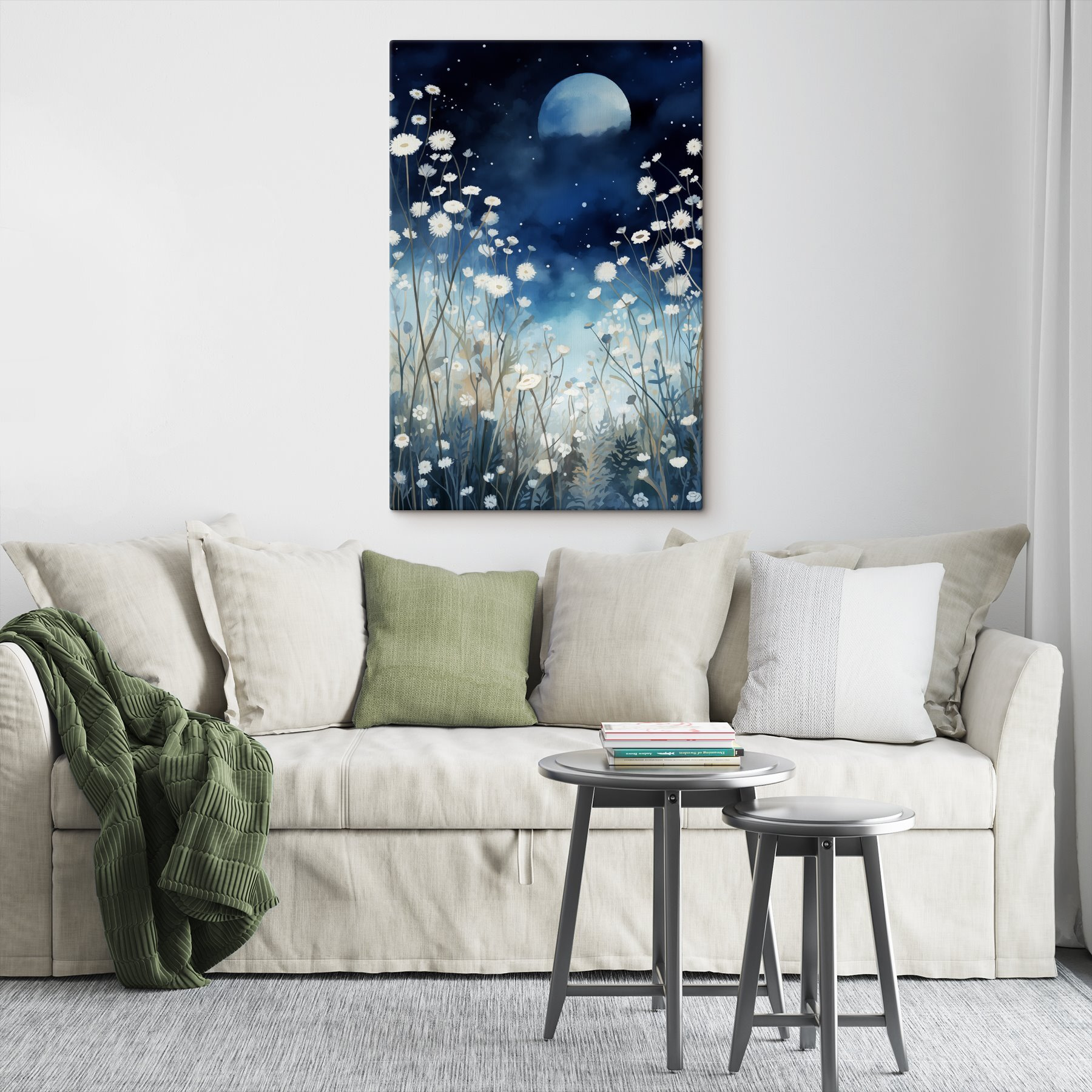 Verwandeln Sie Ihren Raum mit diesem bezaubernden Leinwandbild mit weißen Blumen vor einem verträumten Nachthimmel. Stellen Sie sich vor, Sie spazieren durch einen mondbeschienenen Garten, in dem das sanfte Schwingen der Blütenblätter die Geheimnisse der Natur verrät. Diese zarten Blüten sind wie kleine Sterne, die über einen sanften blauen Hintergrund verstreut sind und ein Gefühl von Ruhe und Gelassenheit vermitteln. Dieses Kunstwerk eignet sich perfekt für eine gemütliche Leseecke oder als Blickfang im Wohnzimmer, da es sowohl Eleganz als auch Gelassenheit ausstrahlt. Lassen Sie sich jeden Tag zu süßen Tagträumen und einem Hauch von Magie der Natur inspirieren. Wer hätte gedacht, dass Blumen auf diese Weise das Rampenlicht stehlen können?