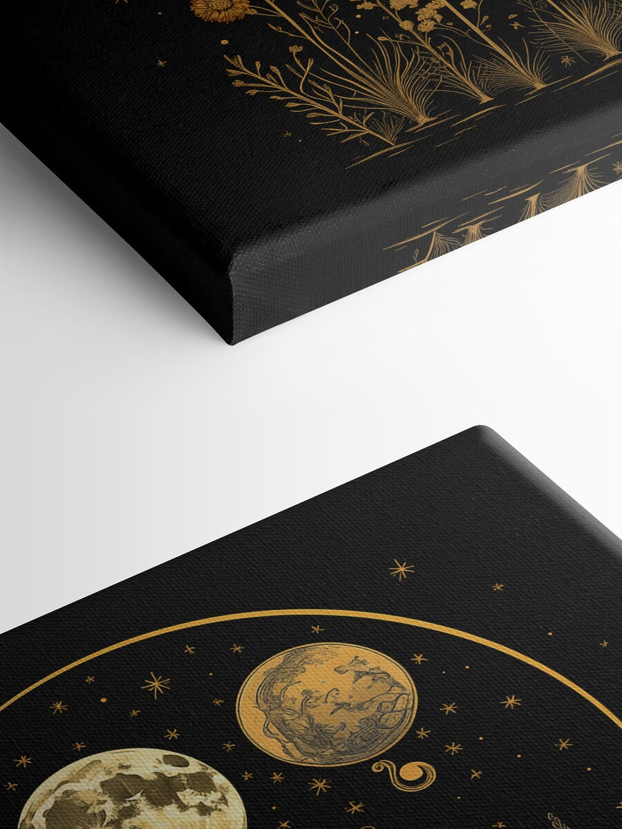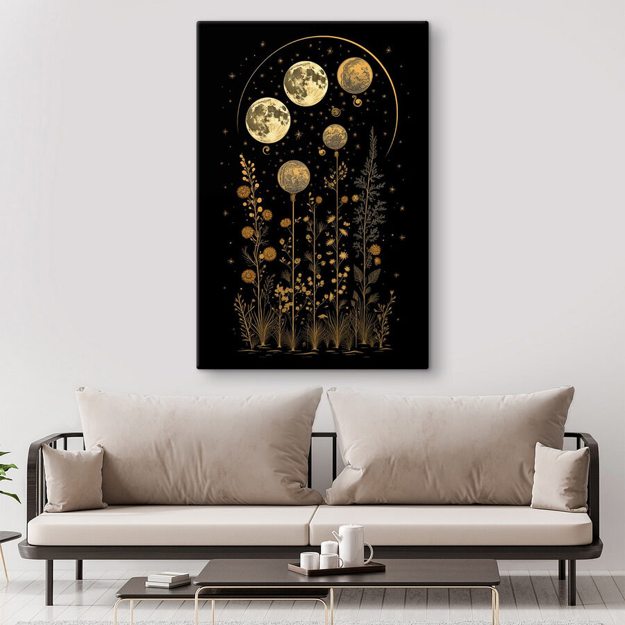 Dieser bezaubernde Leinwanddruck, der den faszinierenden Tanz der Mondphasen vor einem tiefschwarzen Hintergrund zeigt, verwandelt jeden Raum. Es ist, als hätten Sie ein kleines Stück des Nachthimmels direkt in Ihrem Wohnzimmer. Stellen Sie sich vor, Sie machen es sich mit einem guten Buch gemütlich und das sanfte Leuchten dieser Himmelskörper verleiht Ihrer gemütlichen Ecke eine verträumte Stimmung. Die zarten floralen Akzente untermalen die Monde und schaffen ein perfektes Gleichgewicht, das lebendig und doch beruhigend wirkt. Dieses Kunstwerk weckt die Neugierde und regt die Fantasie an – perfekt für alle, die die Wunder der Natur und einen Hauch von Mysterium schätzen. Ob im Schlafzimmer, im Arbeitszimmer oder am Lieblingsplatz Ihrer Freunde, dieses Kunstwerk lädt zu Gesprächen ein. Sehen Sie zu, wie sich Ihre Gäste in den komplizierten Details verlieren und über alles Mögliche nachdenken, vom Kosmos bis hin zu einem Garten um Mitternacht. Ein Hauch von Laune, ein Hauch von Natur und eine Menge Charme – was kann man daran nicht lieben?