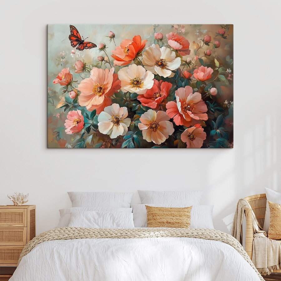 Dieser wunderschöne Leinwanddruck mit einem Schmetterling, der über einen herrlichen Blumenstrauß gleitet, verleiht jedem Raum eine besondere Note. Es ist, als würde man sich ein kleines Stück Natur nach Hause holen. Die sanften Farben und filigranen Details ziehen das Auge an und erinnern an gemütliche Sommernachmittage im Garten, vielleicht sogar mit einem guten Buch in der Hand – genau die richtige Stimmung, oder? Perfekt für ein Wohnzimmer, ein Schlafzimmer oder sogar eine gemütliche Ecke, in der die Kreativität blüht. Es ist ein Stück, das Freude bereitet und als sanfte Erinnerung an die Schönheit der Natur dient und die Wände in einen fröhlichen Rückzugsort verwandelt. Wer würde da nicht lächeln?