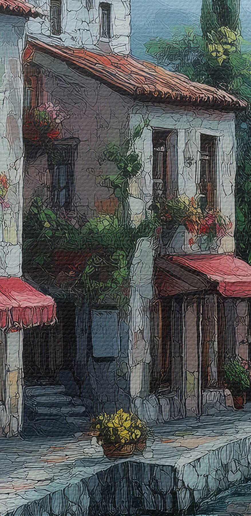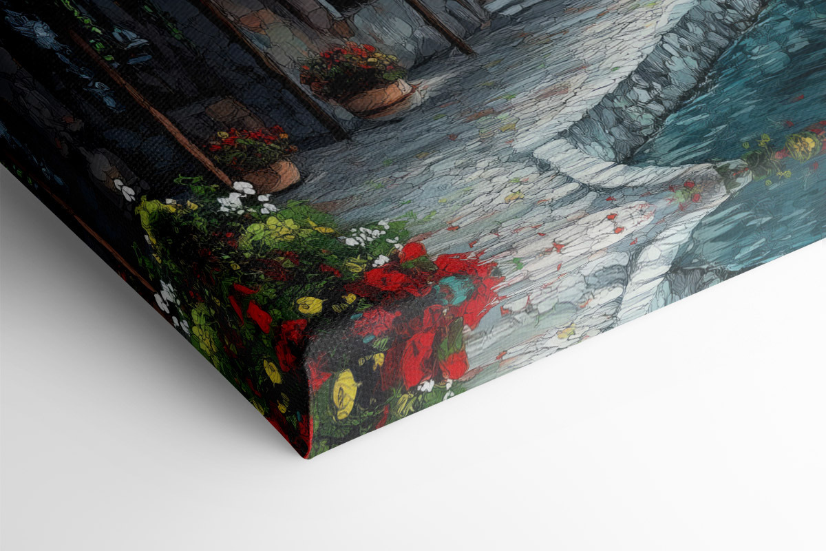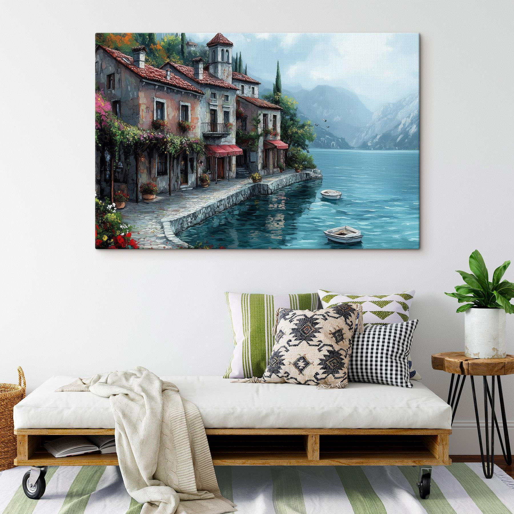 Stellen Sie sich vor, Sie treten in eine ruhige Szene, in der sich charmante Gebäude an einen schimmernden See schmiegen, umrahmt von üppigem Grün und fernen Bergen. Dieser Leinwanddruck fängt diese verträumte Stimmung ein und bringt ein Stück friedliche Flucht direkt in einen Raum. Es eignet sich perfekt für eine Leseecke oder zur Aufhellung eines Flurs und erinnert an gemütliche Nachmittage, an denen man Kaffee trinkt oder spontane Bootsausflüge plant. Mit seinen leuchtenden Farben lädt er zu Wärme und Fröhlichkeit ein und verleiht jedem Raum ein bisschen mehr Wohnlichkeit. Und wer möchte nicht jeden Tag das Gefühl haben, in einem Mini-Urlaub zu sein?