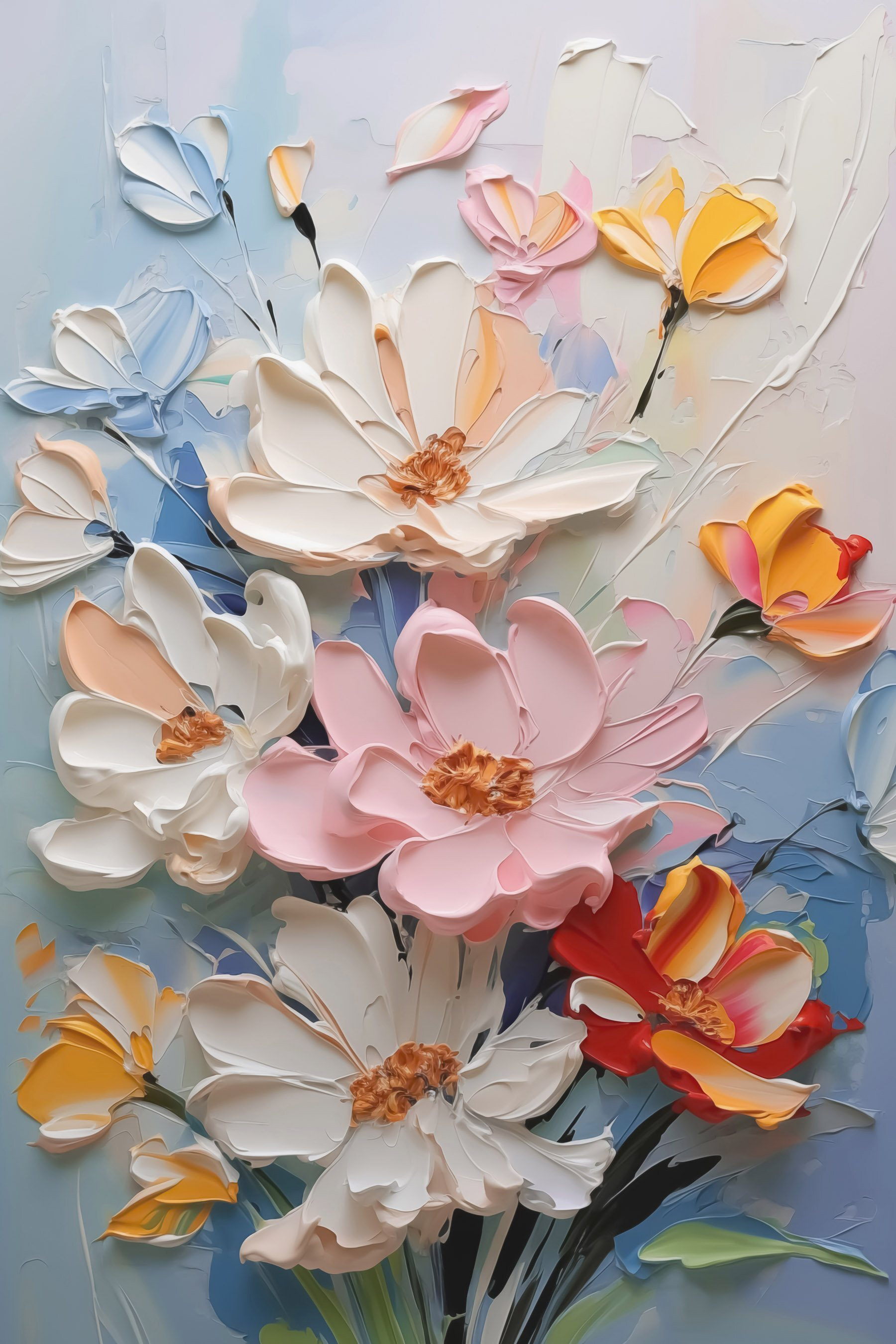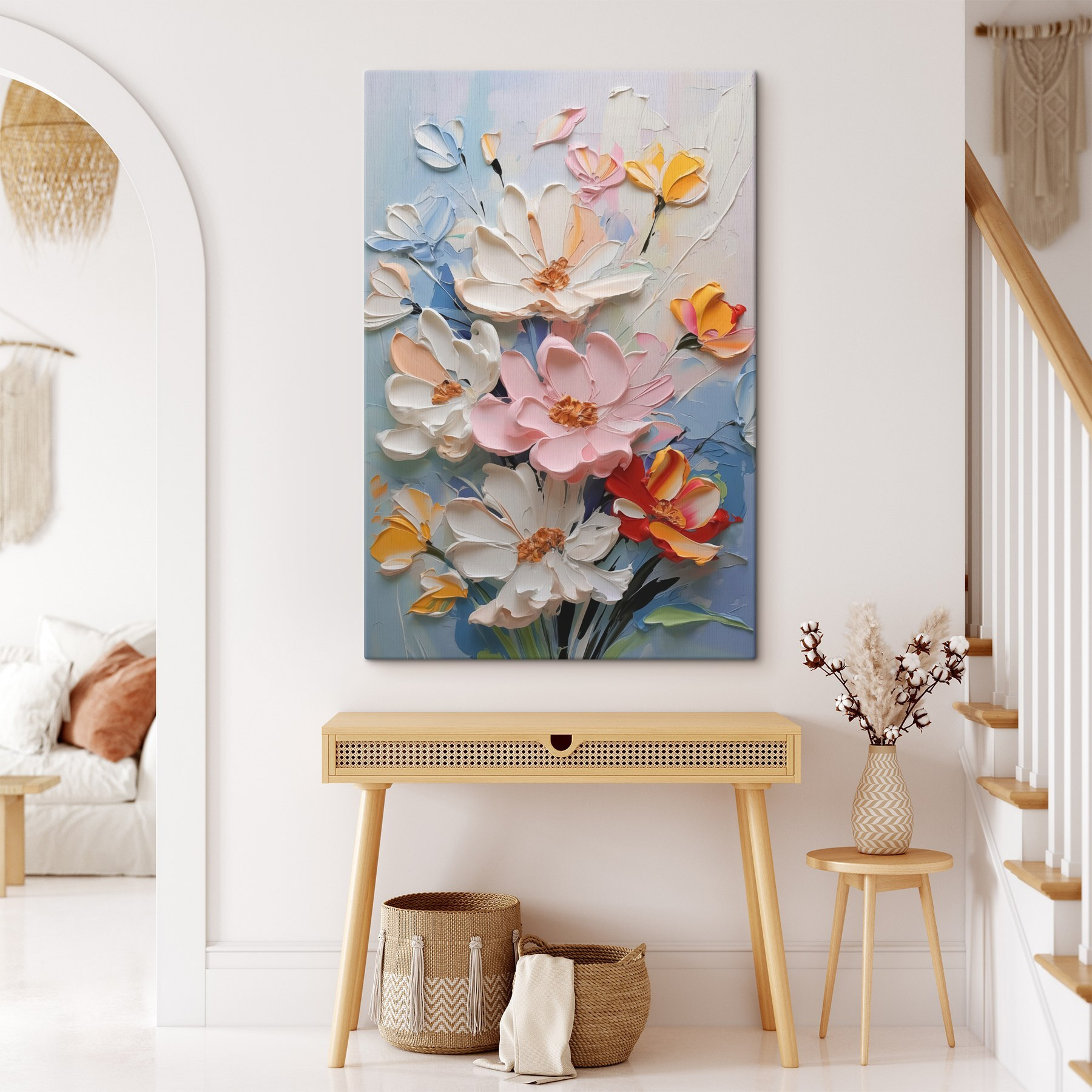 Verwandeln Sie jede Wand in einen Hauch von frischer Luft mit diesem atemberaubenden Leinwanddruck mit einem lebendigen Blumenbouquet. Stellen Sie sich vor, wie Sie in einer gemütlichen Ecke sitzen, umgeben von diesen lebendigen Blüten, die über die Leinwand zu tanzen scheinen und Ihrem Raum einen Hauch von natürlichem Charme verleihen. Die leuchtenden Farben heben sofort die Stimmung in jedem Raum. Ob im Wohnzimmer, im Schlafzimmer oder sogar im Flur, es weckt das ganze Jahr über Frühlingsgefühle. Perfekt zum Tagträumen oder um sich bei einem Kaffee in Gedanken zu verlieren – wer würde das nicht wollen? Bringen Sie das Lächeln zum Vorschein!