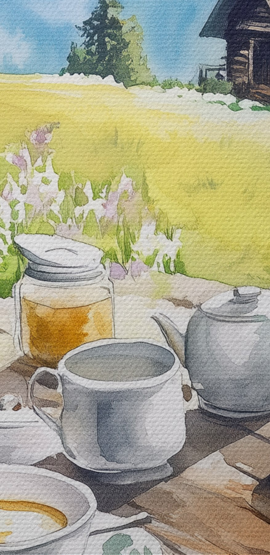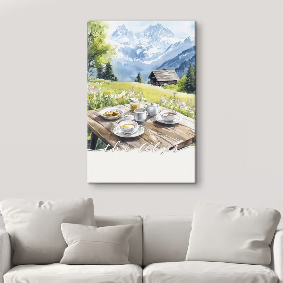 Stellen Sie sich vor, wie Sie an einer warmen Tasse Tee nippen, während Sie sich in der heiteren Stimmung des Bildes “Wandbilder Table with Food on It and a House in the Background” sonnen. Dieses entzückende Bild zeigt eine gemütliche Alpenszene, die Sie an einen friedlichen Morgen entführt – denken Sie an frisches Gebäck, eine leichte Brise und die majestätischen Berge im Hintergrund. Es ist perfekt, um eine Küche oder einen Essbereich zu verschönern. Jeder Blick entführt Sie in eine Welt, in der Natur und gutes Essen aufeinandertreffen und die alltäglichen Momente zu etwas ganz Besonderem machen. Wer würde seinen Tag nicht gerne inmitten eines solchen Charmes beginnen? Bringen Sie einen Hauch von Ruhe in Ihren Raum – die Blumen, die Bergluft und der rustikale Charme laden geradezu zum Brunch ein!