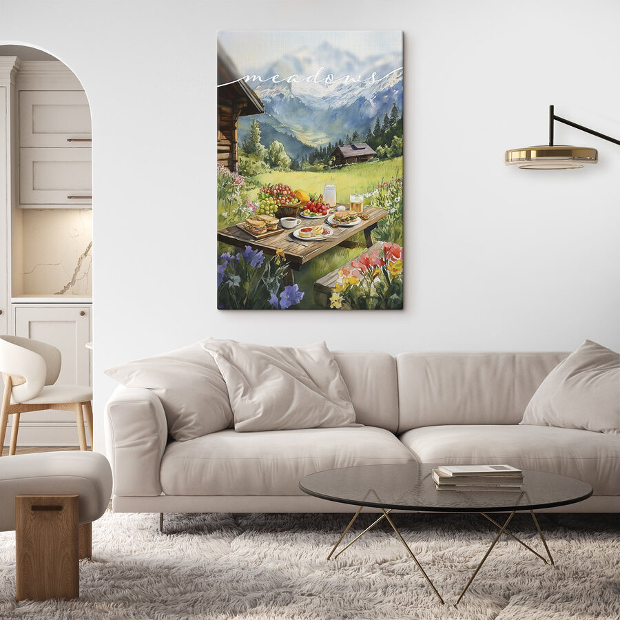 Stellen Sie sich einen sonnigen Tag vor, ein frisches Essen auf einem Feld voller Wildblumen – dieser Leinwanddruck fängt diese Stimmung perfekt ein. Der charmante Holztisch ist mit bunten Früchten, Sandwiches und Getränken gedeckt und wirkt wie eine Einladung, Freunde zu einem entspannten Nachmittagsschmaus zu versammeln. Der Hintergrund aus majestätischen Bergen bringt einen Hauch von Abenteuer in den Raum. Sie lässt jeden Raum sofort wärmer erscheinen und weckt Tagträume von Picknicks und Lachen. Es riecht fast wie frischer Kaffee, nicht wahr? Es ist ein Stück, das Sie jedes Mal zum Schmunzeln bringt, wenn Sie es betrachten, und das Sie an einfache Freuden erinnert. Dieses Bild an der Wand zu haben, ist wie ein kleines Stückchen Glück genau dort, wo man es braucht!