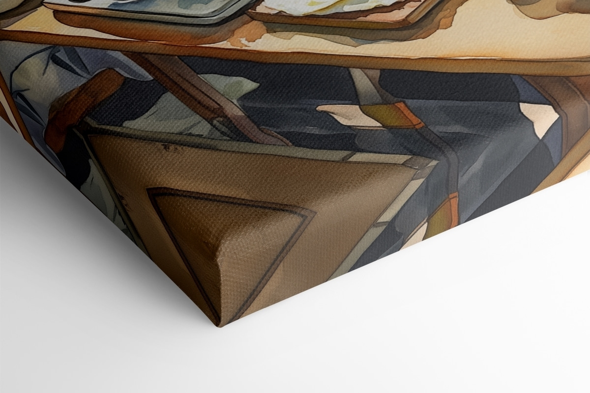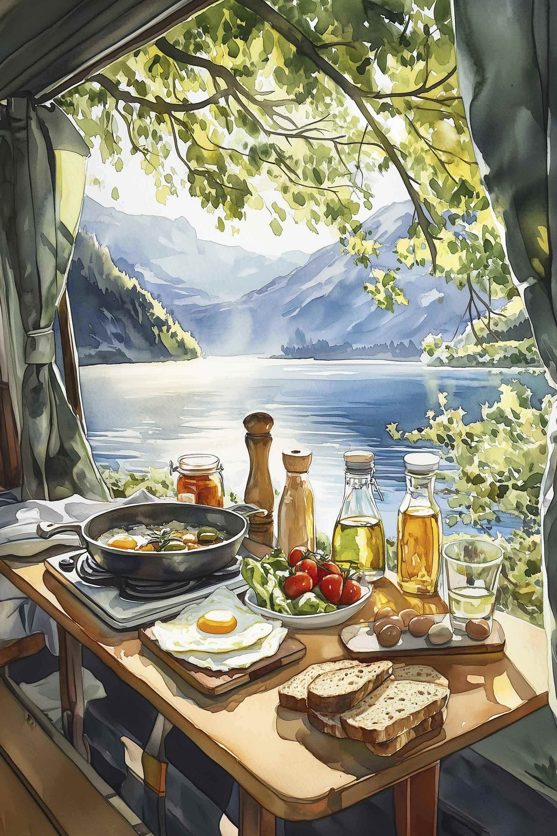 Stellen Sie sich vor: ein sonniger Morgen am See, der Duft von frischen Eiern, die in der Pfanne brutzeln, und das sanfte Rascheln der Blätter über Ihnen. Dieser Leinwanddruck fängt diese Stimmung perfekt ein und bringt mit seinen leuchtenden Farben und seinem lässigen Charme die Natur ins Haus. Es ist wie ein kleines Fenster zu einem ruhigen Rückzugsort – eine Erinnerung daran, langsamer zu machen und die einfachen Freuden des Lebens zu genießen. Stellen Sie es sich an Ihrer Wand vor und träumen Sie von Picknicks und gemütlichen Nachmittagen. Es ist nicht nur Dekoration, sondern ein Stück Ruhe, das jeden Raum warm und einladend erscheinen lässt. Ganz gleich, ob es Ihr Fernweh weckt oder Sie einfach nur zum Lächeln bringt, dieses Stück wird mit Sicherheit für Gesprächsstoff sorgen. Denn wer möchte nicht täglich an das Brunch-Glück am See erinnert werden?