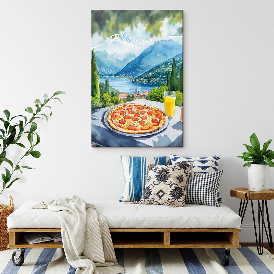 Bringen Sie ein Stück italienischen Charme in Ihren Raum mit diesem entzückenden Leinwanddruck! Stellen Sie sich einen sonnigen Tag, eine frische Pizza mit Peperoni und ein erfrischendes Glas Saft vor einer atemberaubenden Kulisse aus Bergen und Bäumen vor. Jedes Mal, wenn Sie daran vorbeigehen, ist es, als würden Sie einen kleinen Urlaub machen! Perfekt für die Küche oder den Essbereich, inspiriert dieses Stück zu gemütlichen Zusammenkünften und faulen Brunches. Die leuchtenden Farben erhellen den Raum und lassen ihn warm und einladend wirken – wie Ihr Lieblingscafé mit der besten Aussicht. Lassen Sie sich daran erinnern, dass das Leben zu kurz ist für alles andere als köstliche Momente!