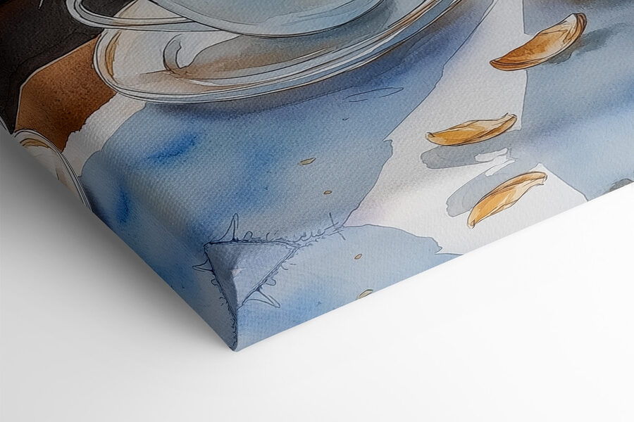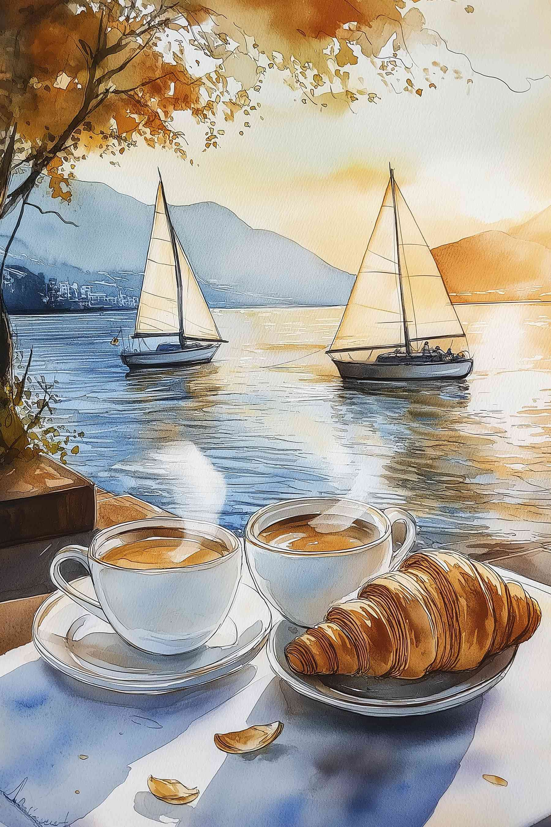 Verschönern Sie Ihre Wände mit diesem entzückenden Leinwandbild, das zwei dampfende Tassen Kaffee und ein flockiges Croissant vor einer friedlichen Wasserszene zeigt. Stellen Sie sich vor, wie Sie Ihren Tag hier beginnen – das Sonnenlicht tanzt auf dem Wasser und der beruhigende Duft von Kaffee erfüllt die Luft. Es ist die Art von gemütlicher Atmosphäre, die dazu einlädt, sich mit einem guten Buch einzukuscheln oder mit einem Freund zu lachen. Dieses Kunstwerk eignet sich perfekt für Küchen oder Frühstücksecken und lädt zu Wärme und Gesprächen ein. Und wer liebt nicht eine kleine Croissant-Inspiration? Holen Sie sich einen Hauch von Café-Glück in Ihr Zuhause!