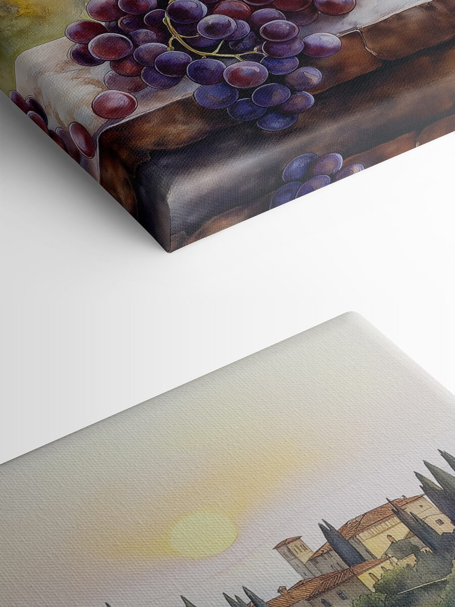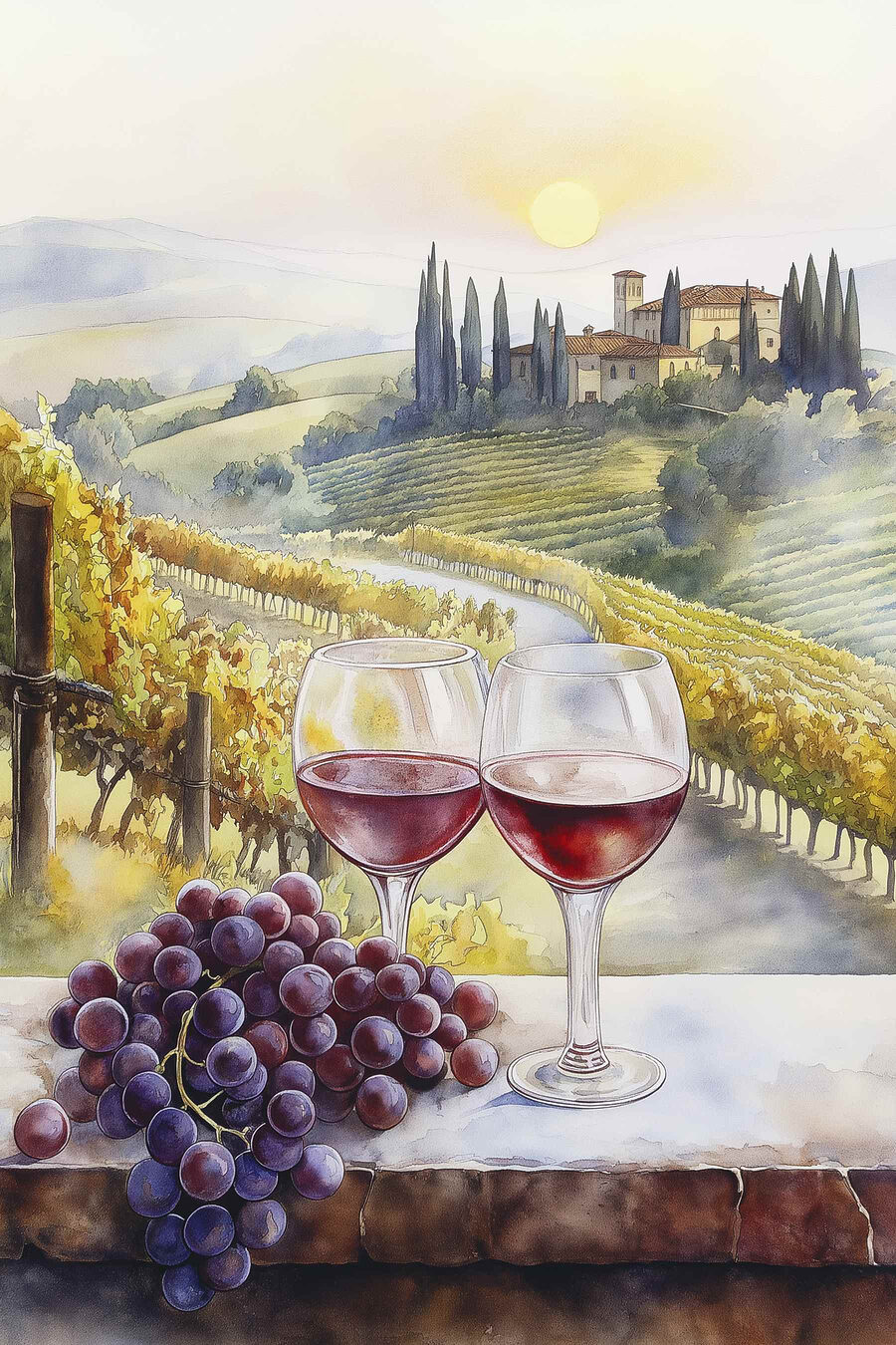 Verwandeln Sie jede triste Wand in eine gemütliche Weinberg-Atmosphäre mit diesem Aquarellbild, das schöne Weingläser und pralle Trauben zeigt. Stellen Sie sich vor, wie Sie an einem leckeren Merlot nippen, während dieses Kunstwerk Sie auf eine verträumte Reise in sonnenbeschienene Weinberge entführt, wo die Luft von dem süßen Duft reifer Trauben und sanftem Lachen erfüllt ist. Es ist, als ob Sie sich ein Stück Italien direkt nach Hause holen würden! Dieses Stück eignet sich perfekt für eine Essecke oder eine schicke kleine Bar und verleiht ihr einen Hauch von Farbe und Charme. Wer würde sich nicht ein bisschen schick fühlen, wenn er sein nächstes Glas Wein neben einer solchen Schönheit genießt?