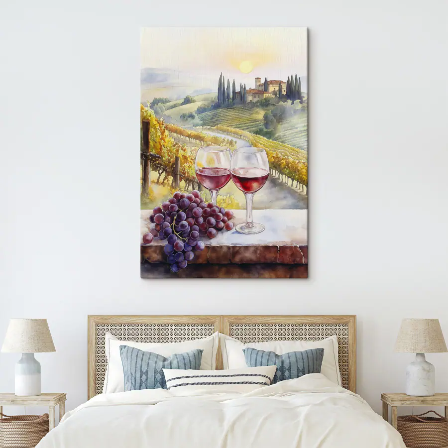 Verwandeln Sie jede triste Wand in eine gemütliche Weinberg-Atmosphäre mit diesem Aquarellbild, das schöne Weingläser und pralle Trauben zeigt. Stellen Sie sich vor, wie Sie an einem leckeren Merlot nippen, während dieses Kunstwerk Sie auf eine verträumte Reise in sonnenbeschienene Weinberge entführt, wo die Luft von dem süßen Duft reifer Trauben und sanftem Lachen erfüllt ist. Es ist, als ob Sie sich ein Stück Italien direkt nach Hause holen würden! Dieses Stück eignet sich perfekt für eine Essecke oder eine schicke kleine Bar und verleiht ihr einen Hauch von Farbe und Charme. Wer würde sich nicht ein bisschen schick fühlen, wenn er sein nächstes Glas Wein neben einer solchen Schönheit genießt?