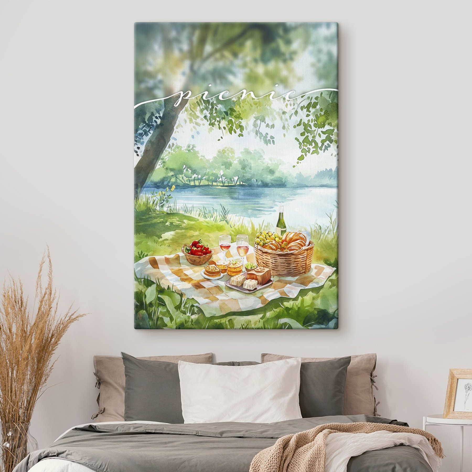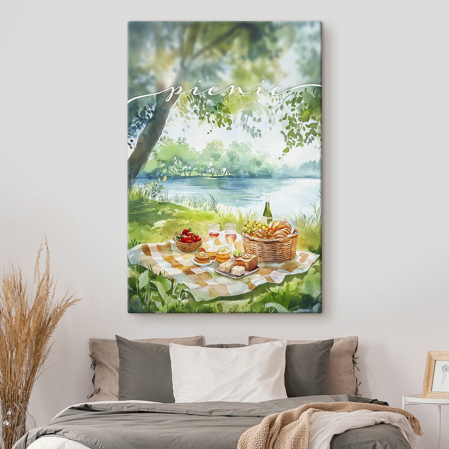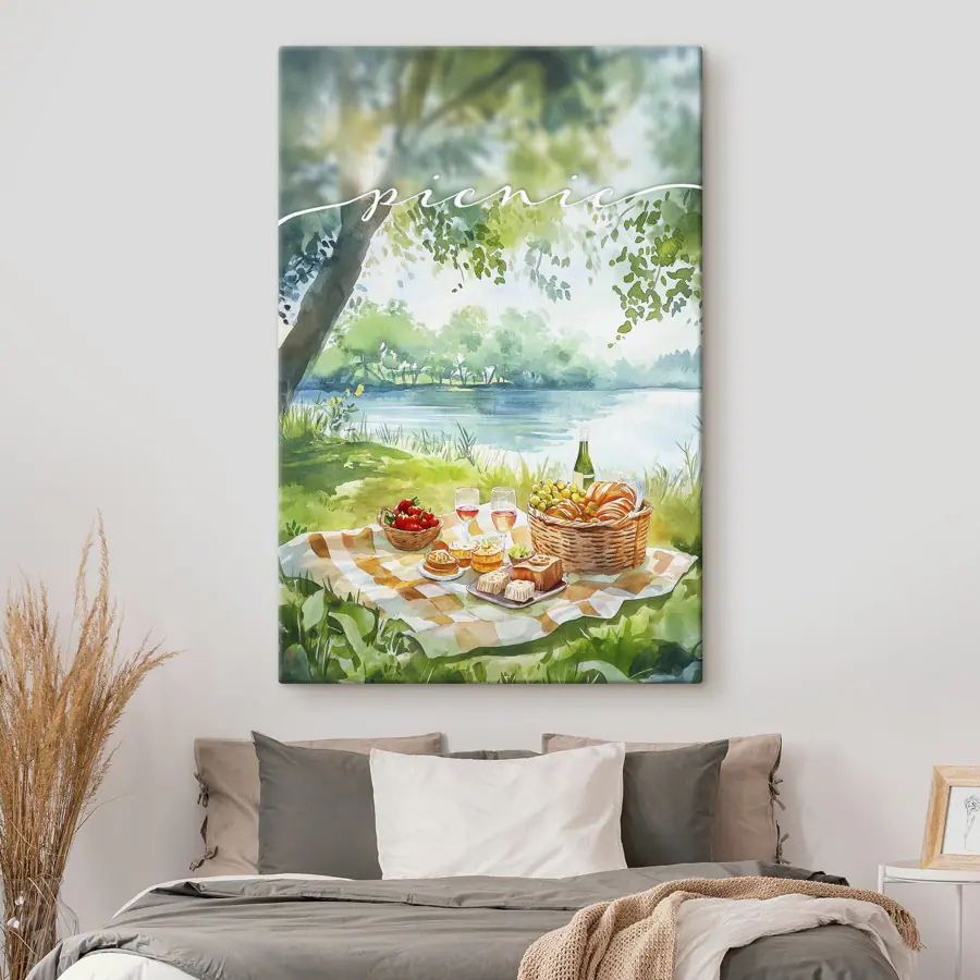 Bringen Sie einen Hauch von Laune in Ihren Raum mit dieser entzückenden Aquarelldarstellung eines Picknicks am See. Stellen Sie sich das sanfte Rascheln der Blätter und den erfrischenden Duft der Natur vor, während Sie den Anblick von Erdbeeren, Käse und einem kühlen Glas Rosé genießen. Dieses Stück erinnert an faule Sommertage – perfekt zum Träumen oder zum Planen Ihres nächsten Festes im Freien. Es ist eine Einladung zum Entspannen, Relaxen und vielleicht sogar zu einem spontanen Picknick-Abenteuer. Hängen Sie es an einem Ort auf, an dem Sie es täglich sehen können, und lassen Sie sich von der heiteren Stimmung zu Momenten der Freude inspirieren. Perfekt für Naturliebhaber und alle, die die einfachen Freuden des Lebens zu schätzen wissen – denn wer liebt nicht einen guten Snack in der Sonne?
