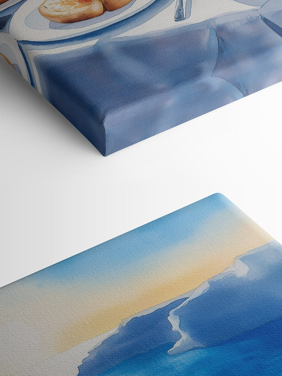 Stellen Sie sich vor, Sie wachen mit einer Aussicht wie dieser auf! Dieser Leinwanddruck fängt perfekt eine sonnige Frühstücksszene auf einer lebhaften Terrasse am Meer ein. Stellen Sie sich Teller mit farbenfrohen Speisen wie fluffigen Eiern und frischen Salaten vor, neben erfrischenden Getränken, die einen köstlichen Start in den Tag versprechen. Es ist, als würde die mediterrane Brise das Lachen von Freunden herübertragen, die sich beim Brunch Geschichten erzählen. Hängen Sie es in Ihrer Küche oder Ihrem Essbereich auf, und plötzlich fühlt sich das Frühstück wie ein Mini-Urlaub an. Wer möchte nicht mit dieser Art von Energie in den Tag starten? Ein kleines Stückchen Paradies direkt bei Ihnen zu Hause!