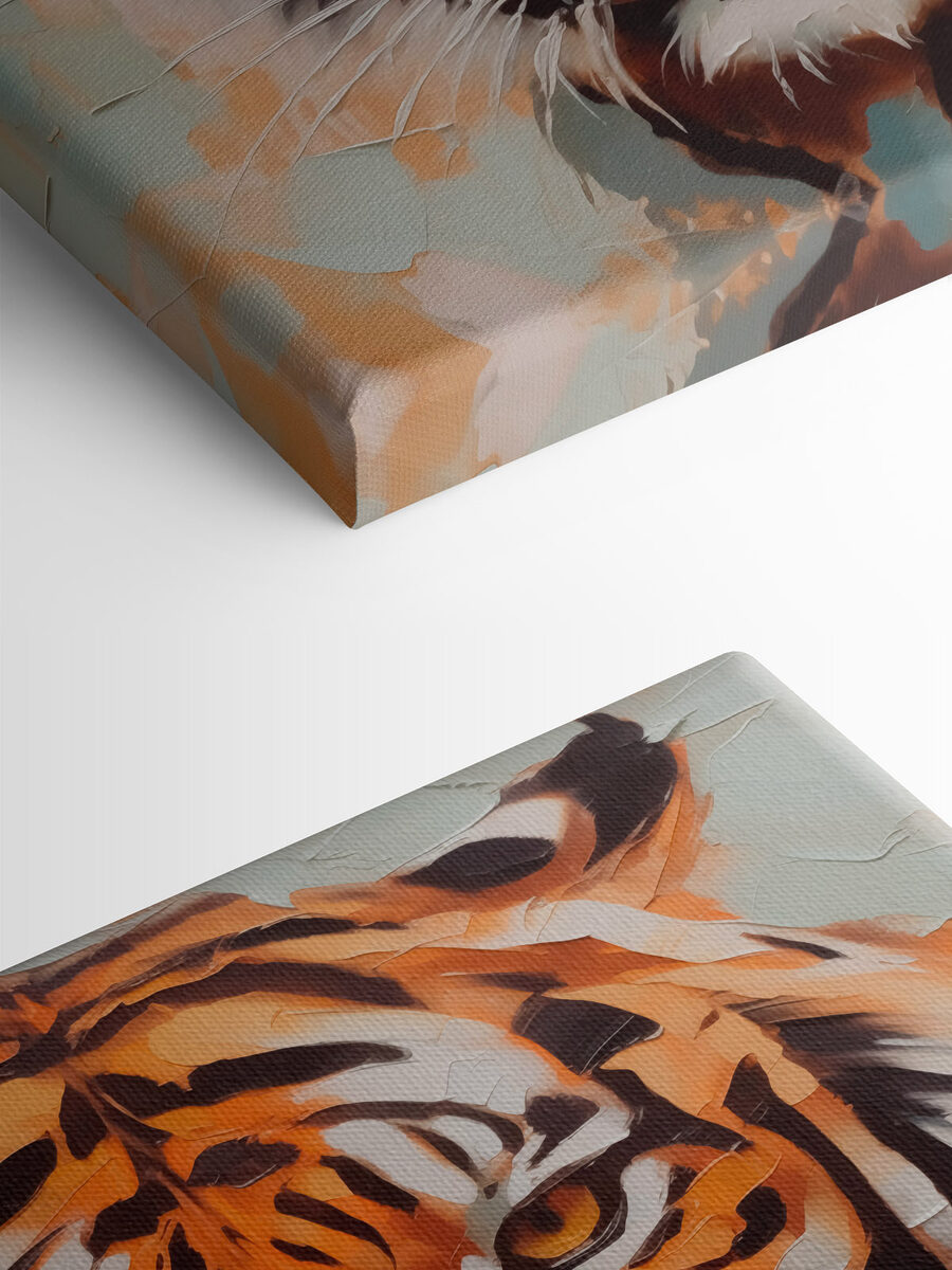Verwandeln Sie jede Wand in ein Paradies für Wildtiere mit diesem beeindruckenden Leinwanddruck eines Tigers, dessen intensiver Blick Sie praktisch direkt anspringt! Es ist nicht nur ein Kunstwerk, sondern auch ein Gesprächsanlass, der den wilden Geist ins Haus holt – Vorsicht, vielleicht fühlen Sie sich wie auf einer Dschungelsafari. Stellen Sie sich vor: Sie trinken einen Tee, und der Tiger fällt Ihnen ins Auge und erinnert Sie daran, dass das Leben ein kleines Abenteuer ist. Jeder Pinselstrich erzählt eine Geschichte, und der Glasscherbeneffekt? Genial! Er verleiht dem Bild einen Hauch von Dramatik, wie aus einer Naturdokumentation, nur ohne die lästigen Moskitos. Perfekt für Tierliebhaber oder alle, die ihrem Raum etwas Pep verleihen wollen. Ein bisschen wild, ein bisschen stilvoll – was will man mehr?