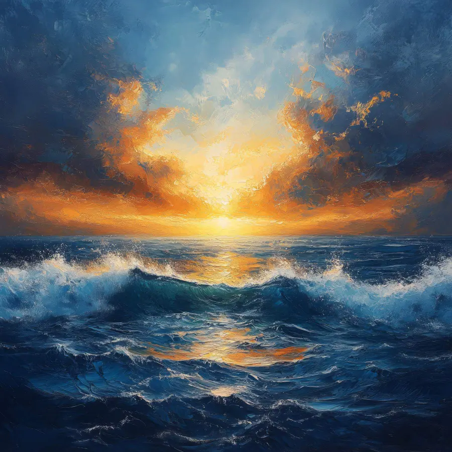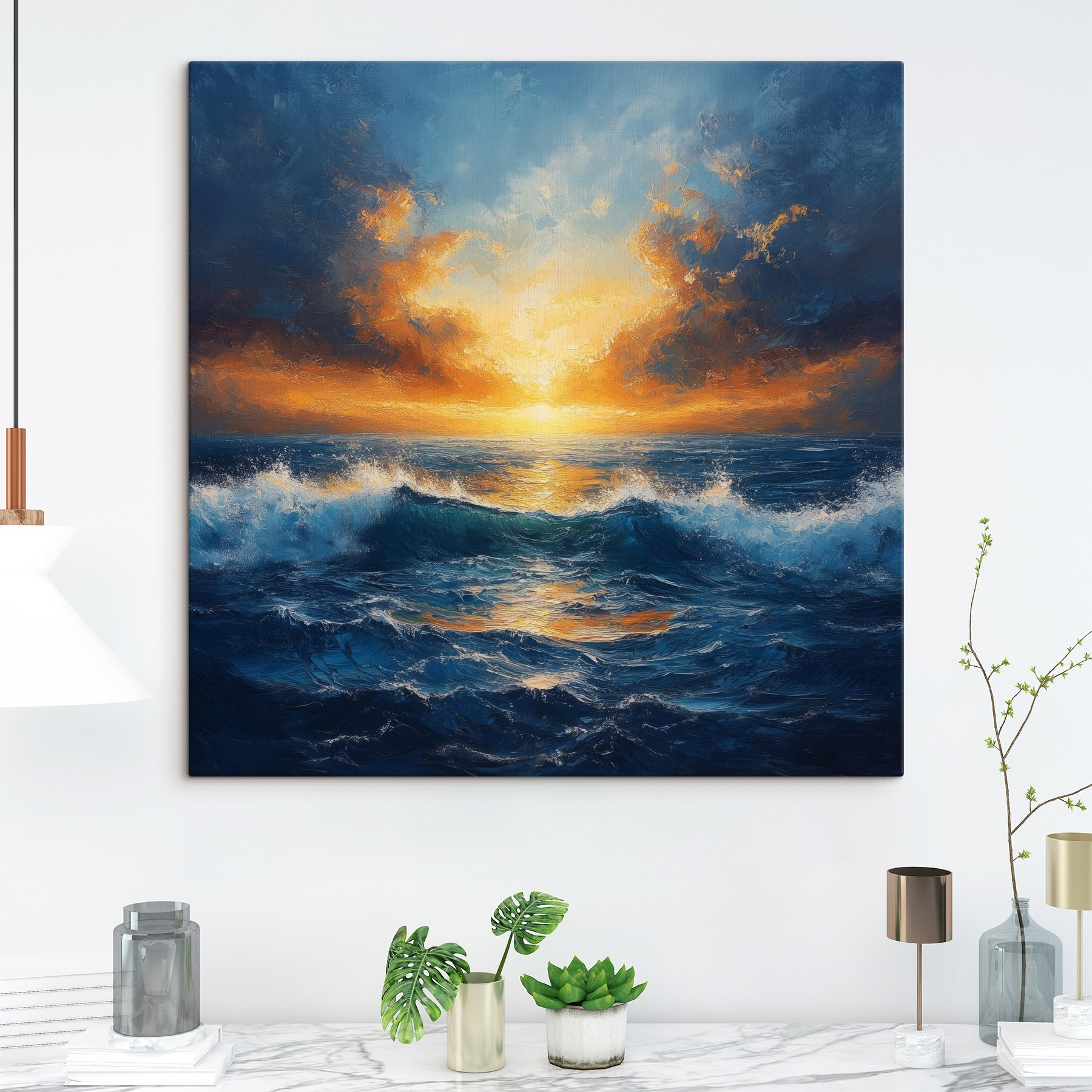 Atmen Sie die Meeresluft ein! Das Bild “Wandbilder Sunset over the Ocean” bringt die atemberaubende Schönheit der Natur direkt in Ihr Wohnzimmer. Stellen Sie sich vor: Sie sitzen auf dem Sofa, und dieser lebhafte Sonnenuntergang ist nur einen Blick entfernt. Die Farben sind knallig – feurige Orangen, tiefe Blautöne und ruhige Wellen – alles spielt zusammen wie eine Tanzparty bei Sonnenuntergang. Es ist fast so, als würde der Ozean Geheimnisse flüstern, während Sie an Ihrem Kaffee nippen. Perfekt für die Tage, an denen Sie eine kleine Flucht oder Inspiration brauchen. Hängen Sie es auf, lehnen Sie sich zurück und lassen Sie Ihre Sorgen Welle für Welle an sich vorbeiziehen. Es ist eine tägliche Erinnerung an die Wunder der Natur, ohne dass man ein Strandtuch braucht.
