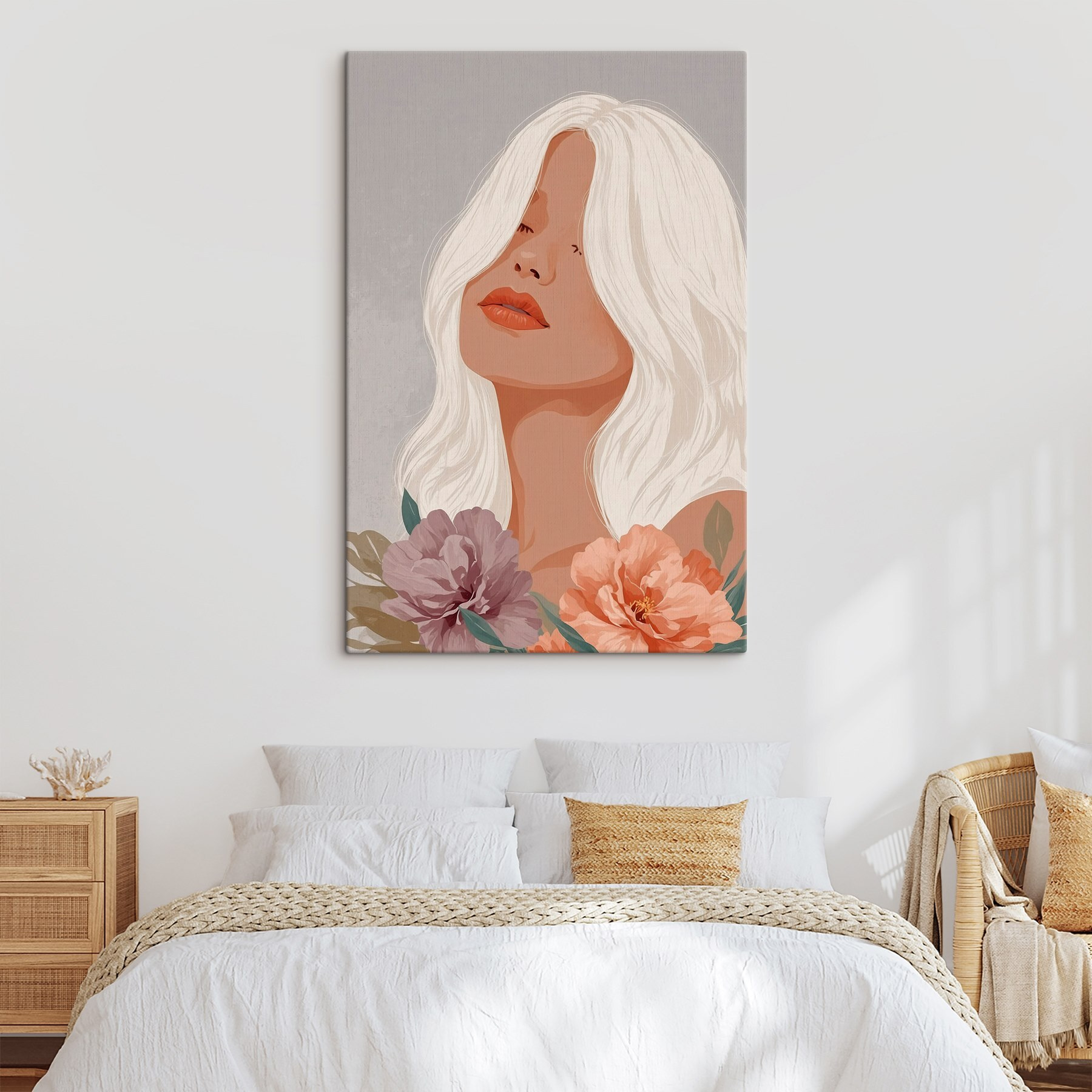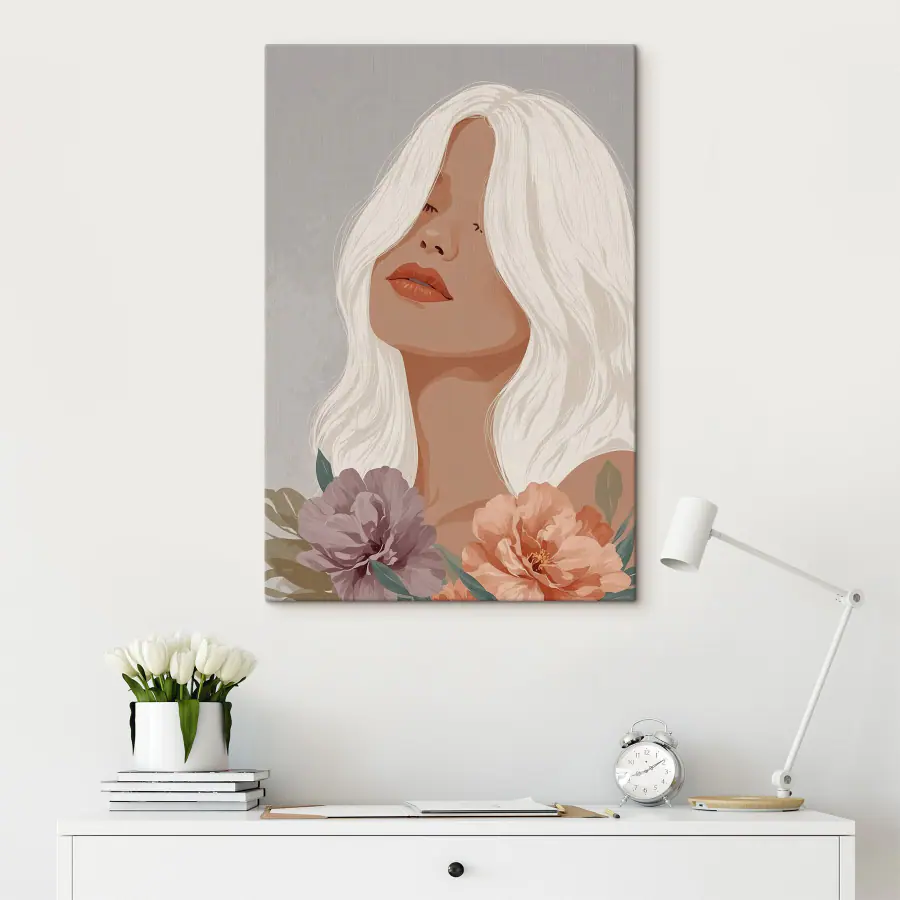Verändern Sie jeden Raum mit diesem atemberaubenden Leinwanddruck einer gelassenen Frau mit langen weißen Haaren, umgeben von zarten Blüten. Es ist wie ein Hauch frischer Luft in Ihrem Raum. Stellen Sie sich eine gemütliche Ecke vor, in der Sie es sich mit einer Tasse Tee gemütlich machen und ihre stille Schönheit betrachten, während Sie in Tagträume abdriften – das ist pure Magie. Die sanften Farbtöne der Blumen sind so einladend, dass sie Ihnen jedes Mal, wenn Sie vorbeigehen, zuflüstern: “Lass uns entspannen”. Dieses Kunstwerk eignet sich perfekt, um Ihren Wänden einen Hauch von Eleganz und den Charme der Natur zu verleihen und lässt Ihre Gäste innehalten und lächeln. Ein kleines Blumenwunderland direkt bei Ihnen zu Hause – wer würde sich das nicht wünschen? Außerdem wird es sicher das eine oder andere Gespräch anregen, denn seien wir ehrlich: Kunst wie diese sitzt nicht einfach still da, sie lädt zu Geschichten und Inspiration ein.