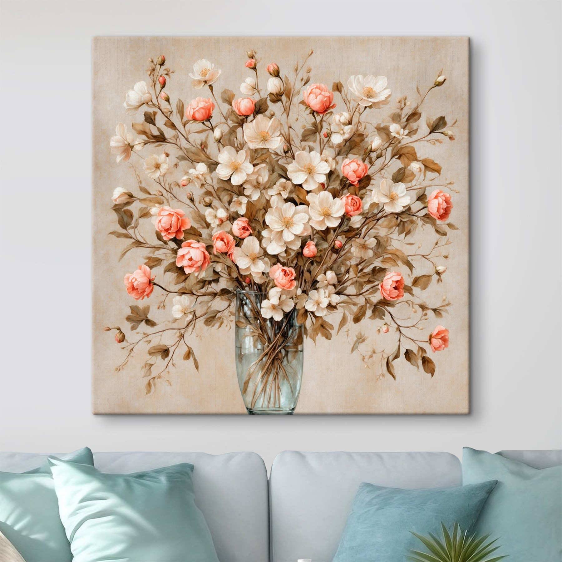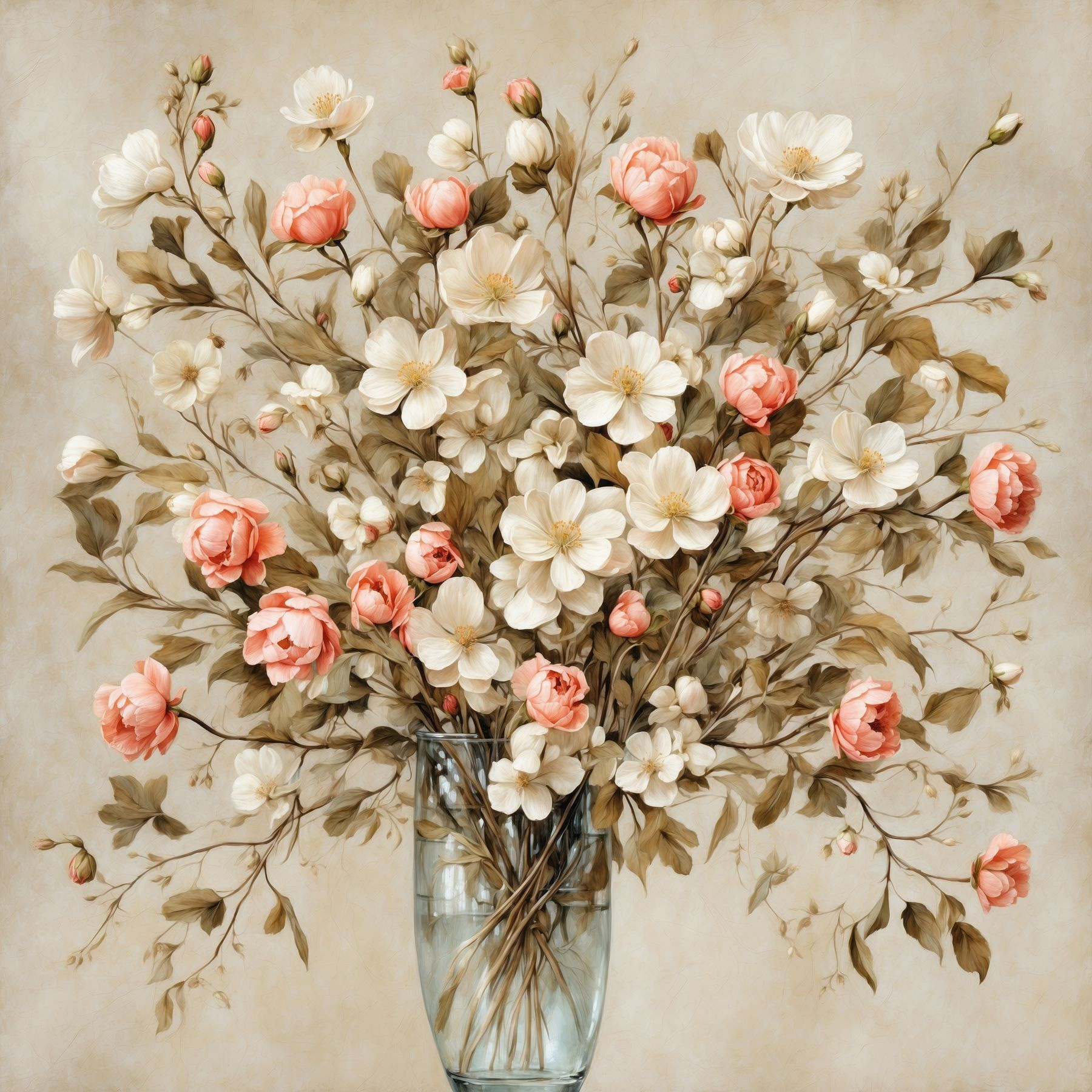 Verschönern Sie Ihren Raum mit diesem atemberaubenden Leinwanddruck von Blumen in einer Vase. Stellen Sie sich vor, Sie betreten einen Raum und werden von dieser entzückenden Blütenpracht begrüßt – perfekt für die Tage, an denen Sie ein wenig zusätzliche Freude brauchen. Die sanften Rosa- und Cremetöne tanzen miteinander und bringen einen Hauch der Schönheit der Natur ins Haus, ohne die Pollen (Gott sei Dank).