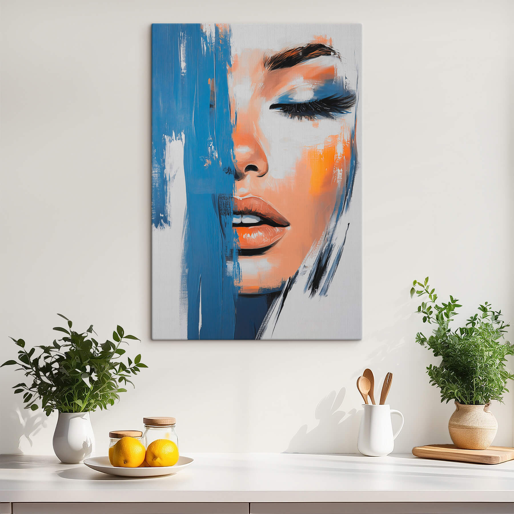 Bringen Sie mit diesem fesselnden Leinwanddruck einen Hauch von kühner Schönheit in Ihren Raum. Das eindrucksvolle Bild eines Frauengesichts, das teilweise von leuchtenden blauen Strichen verdeckt wird, ist das perfekte Herzstück für jeden, der einzigartige Dekoration liebt. Stellen Sie sich vor, Sie betreten einen Raum, und Ihr Blick wird sofort von diesem dramatischen Kunstwerk angezogen. Es flüstert Geschichten, weckt Emotionen und regt zu Gesprächen an. Es eignet sich hervorragend für ein Wohnzimmer oder sogar für eine gemütliche Leseecke – wo auch immer es landet, es wird die Dinge aufmischen. Fügen Sie eine Prise Intrige hinzu und freuen Sie sich über die vielen Komplimente, die Sie erhalten!