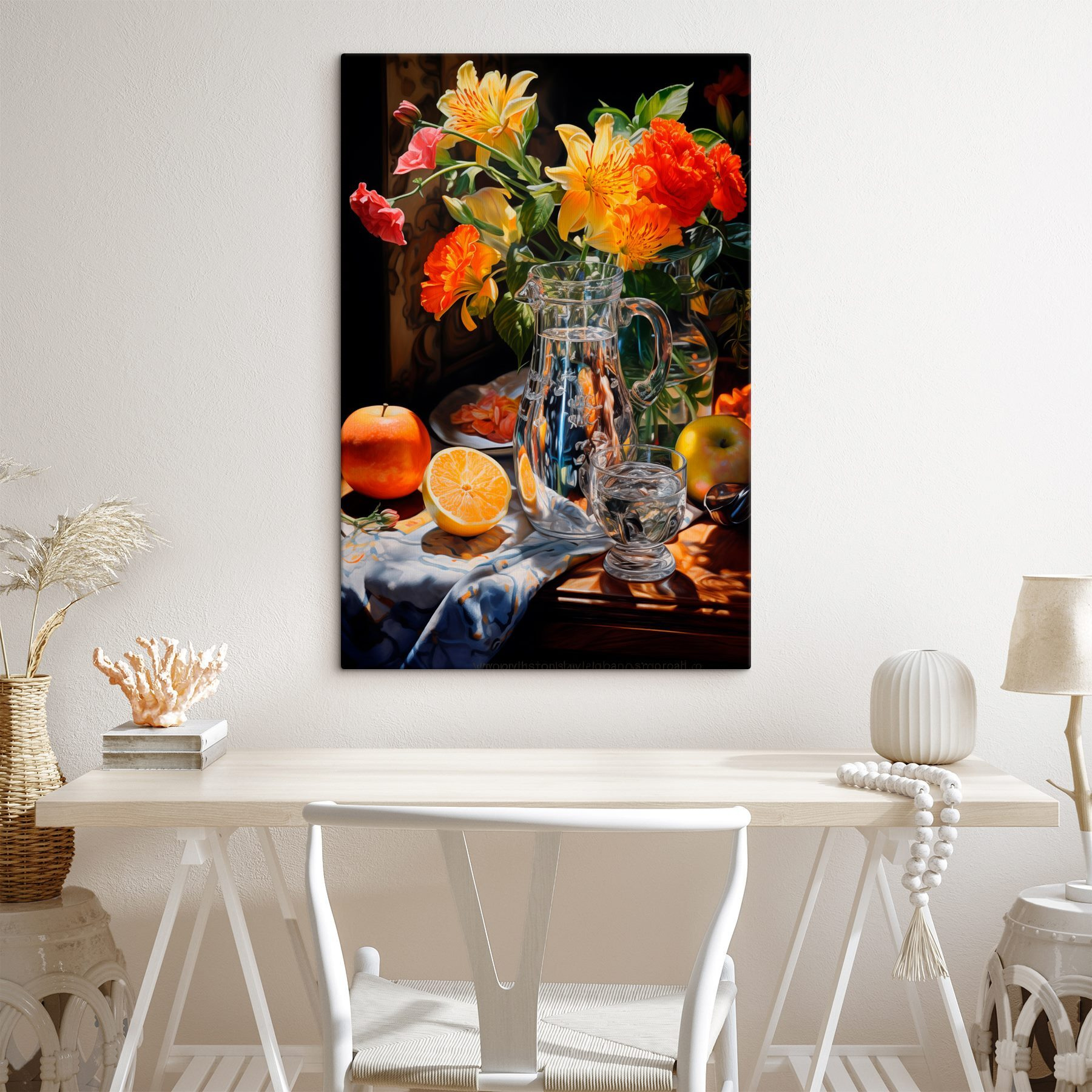 Verschönern Sie Ihren Raum mit diesem auffälligen Leinwandbild “Stillleben mit Blumen und Früchten”. Es ist wie ein kleines Stück Natur, das vor Farben nur so strotzt und jeden zum Lächeln bringt. Stellen Sie sich die zarten Blütenblätter und die saftigen Früchte vor, die Sie zu einem kleinen Snack einladen. Die Spiegelung im Glaskrug lässt die ganze Szene lebendig erscheinen – als ob man das leise Klirren der Eiswürfel im Glas hören könnte. Dieses Kunstwerk eignet sich perfekt für Wohnzimmer oder Küchen und bringt eine warme, einladende Atmosphäre an jede Wand. Es ist mehr als nur Dekoration; es ist eine tägliche Erinnerung daran, innezuhalten, an den Blumen zu riechen und die einfachen Freuden des Lebens zu schätzen. Und wer wünscht sich nicht einen Hauch von blumigem Flair? Hängen Sie es auf, gießen Sie sich einen Drink ein und genießen Sie die Aussicht!