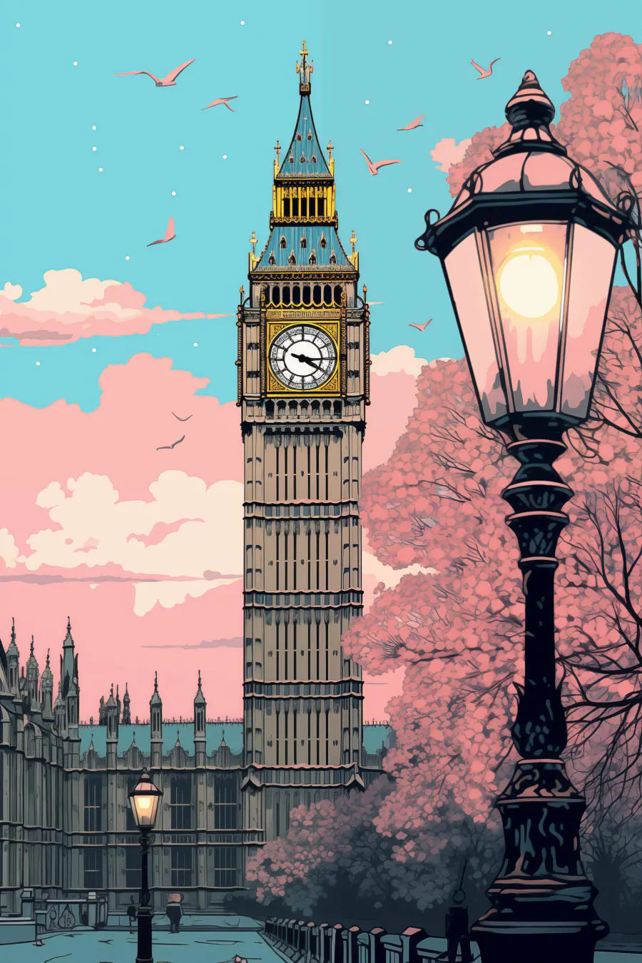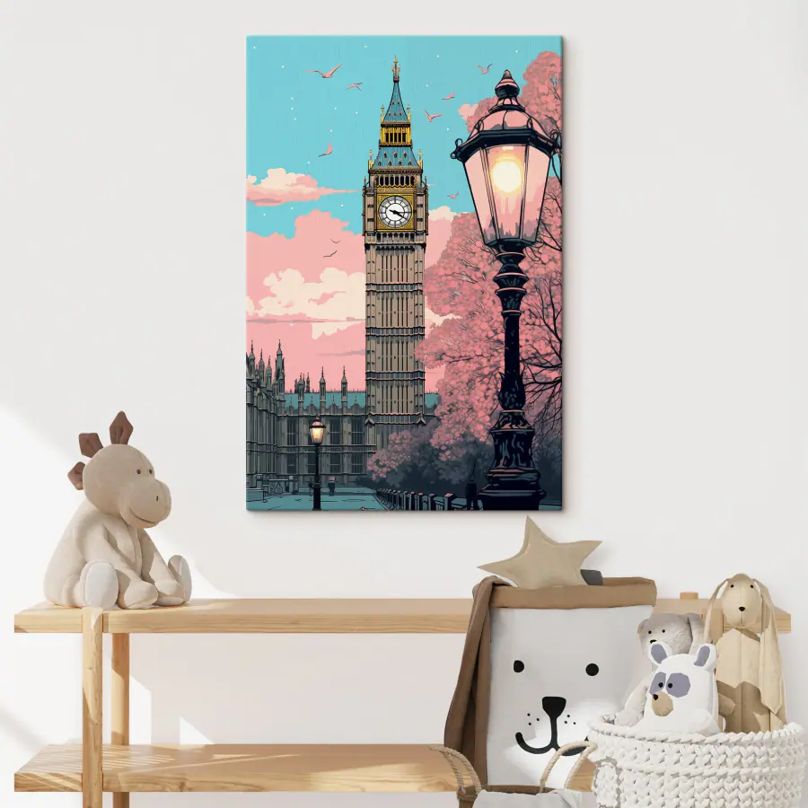 Dieser lebendige Leinwanddruck mit einem atemberaubenden Uhrenturm, umgeben von anmutigen Bäumen und einem charmanten Laternenpfahl, verwandelt jeden Raum. Stellen Sie sich vor, wie Sie im warmen Schein der Straßenlaterne einen Tee trinken, während die Uhr im Hintergrund tickt – perfekt, um von Abenteuern in der Stadt zu träumen. Der verspielte rosa Himmel und die sanften Blautöne sorgen für einen Hauch von Skurrilität und machen es zu einem fantastischen Gesprächsanlass. Hängen Sie es auf und lassen Sie sich von ihm zu Ihren täglichen Unternehmungen inspirieren, sei es zum morgendlichen Kaffee oder zur abendlichen Entspannung. Wer hätte gedacht, dass Wohndekoration Sie so entführen kann?