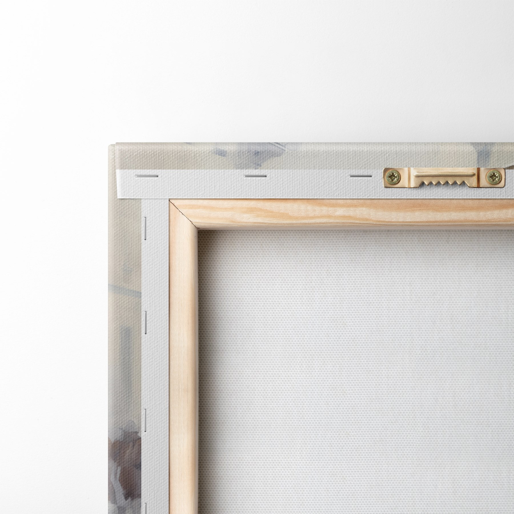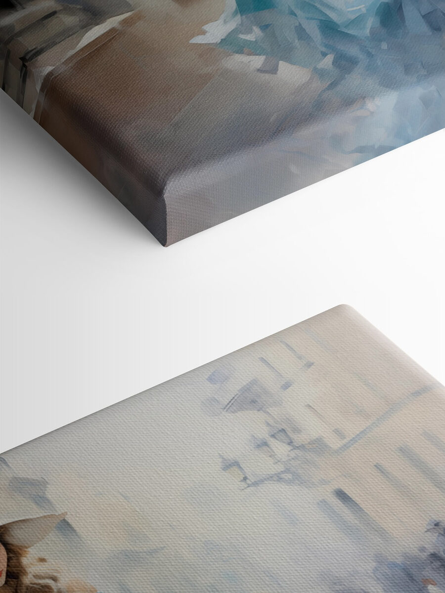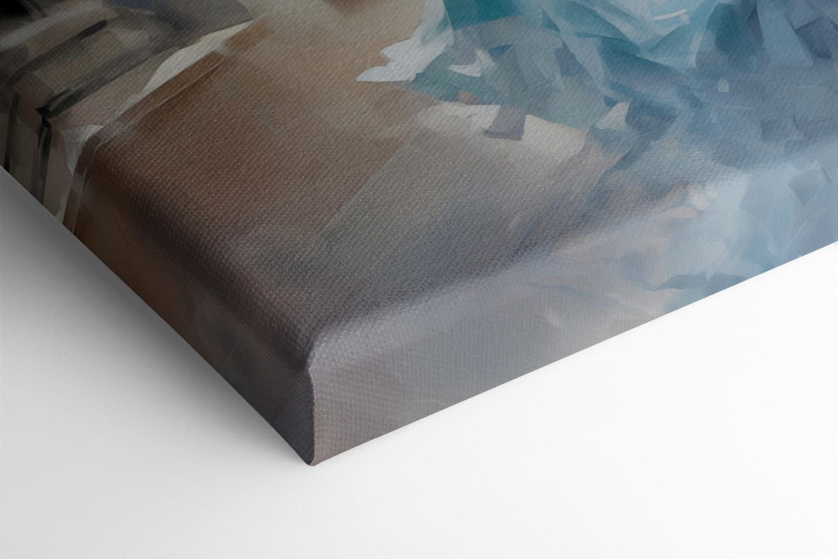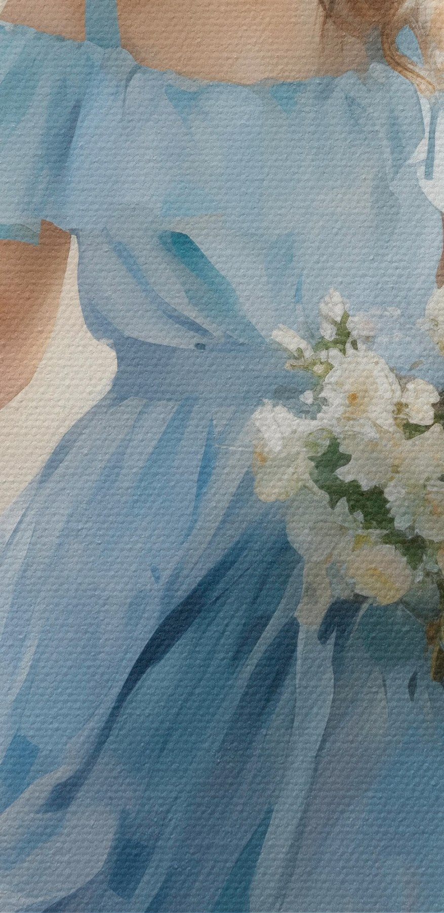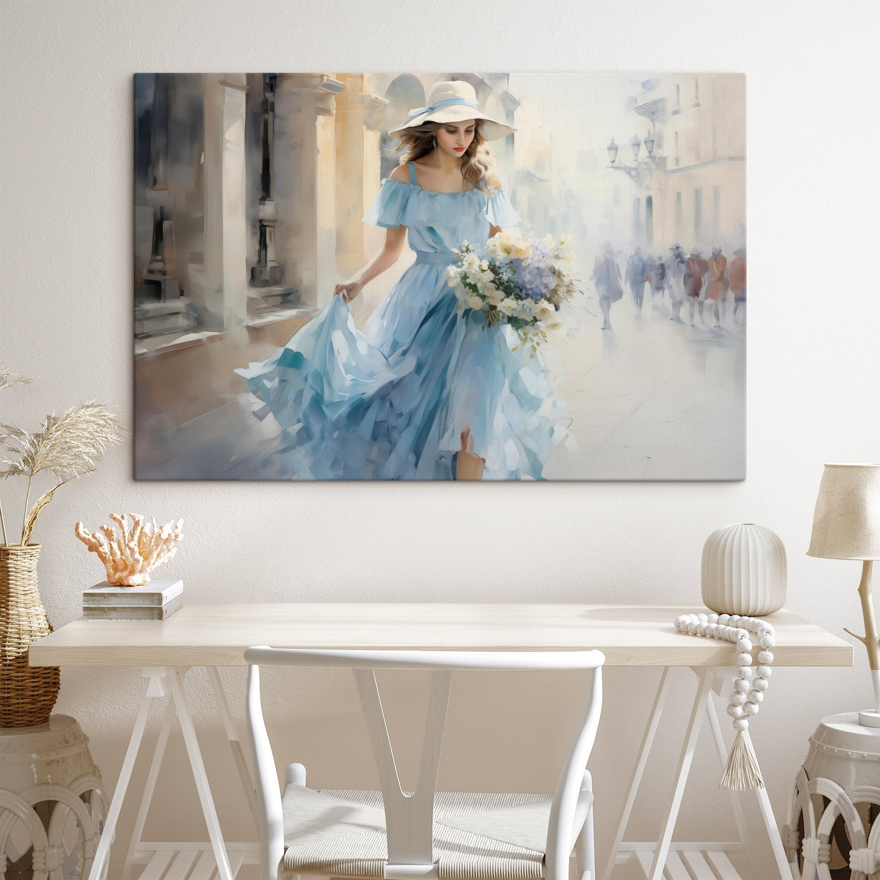 Stellen Sie sich einen heiteren Nachmittag vor, an dem eine hübsche Frau in einem flatternden blauen Kleid sanft durch eine sonnenbeschienene Straße schlendert, Blumen in der Hand – ein wahrer Tagtraum! Dieser Leinwanddruck fängt diesen magischen Moment perfekt ein. Die sanften Blautöne und die zarten Blumen scheinen Wärme und Charme in jeden Raum zu zaubern. Es ist, als hätte man einen Hauch von Freude direkt an der Wand.