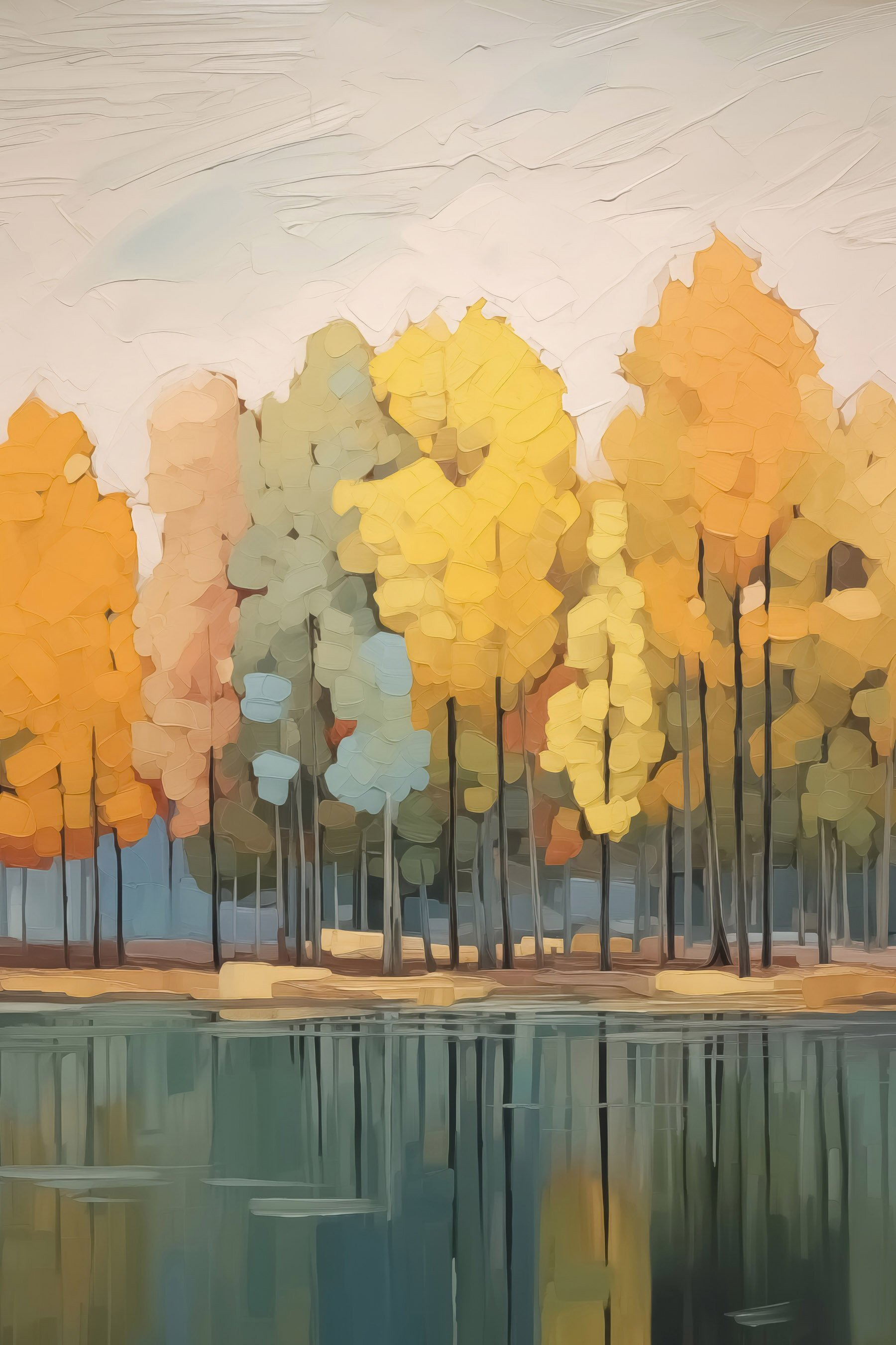 Verwandeln Sie Ihren Raum mit diesem atemberaubenden Leinwandbild “Wandbilder Painting of Trees by Water”. Stellen Sie sich einen Spaziergang durch einen herbstlichen Wald vor, in dem die Blätter ihre leuchtendsten Farben tragen, fast wie Konfetti der Natur. Die leuchtenden Gelbtöne und das sanfte Grün tanzen miteinander und spiegeln sich auf dem ruhigen Wasser wie in einem verträumten Tagtraum. Es vermittelt ein Gefühl von Frieden, wie wenn man mit einer warmen Tasse Tee an einem See sitzt und alles in sich aufsaugt. Perfekt für eine gemütliche Sitzecke oder vielleicht über einem Kamin. Lassen Sie dieses Kunstwerk Gelassenheit in Ihr Zuhause flüstern, damit sich jeder Blick wie eine sanfte Umarmung der Natur anfühlt.