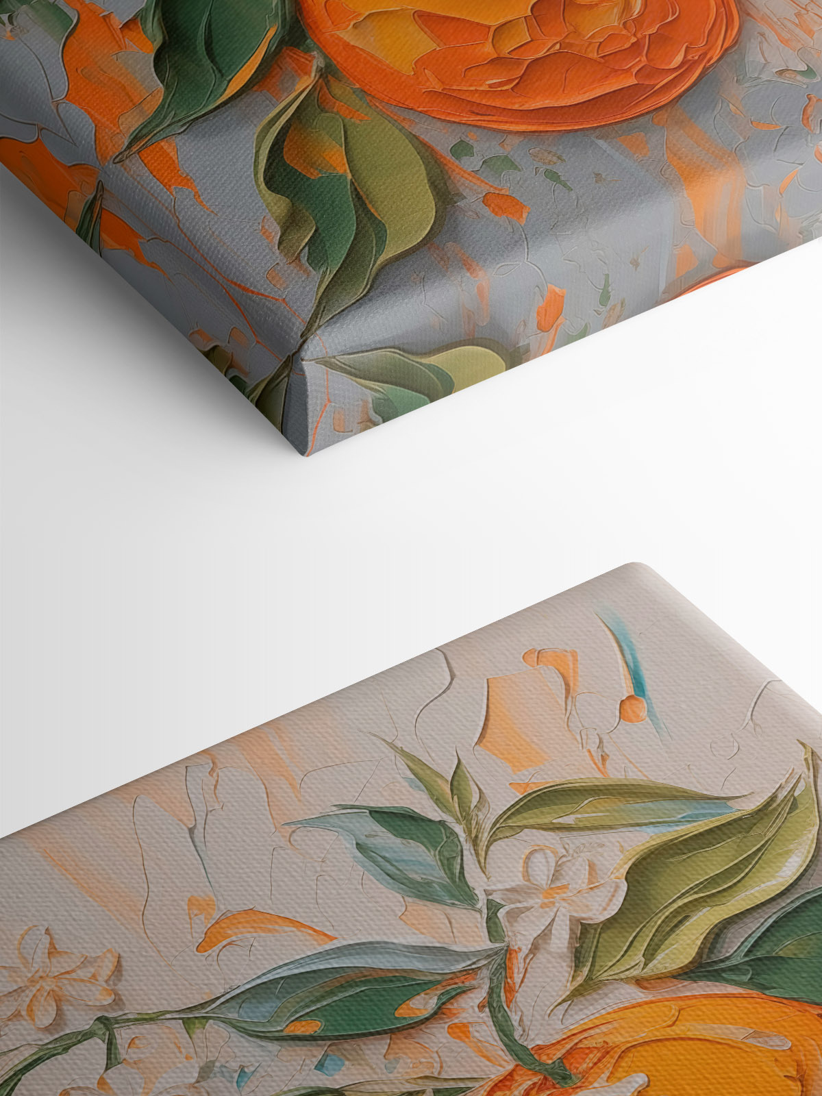 Dieser Leinwanddruck mit fröhlichen Orangen und üppigen grünen Blättern bringt Farbe in Ihren Raum. Es ist wie ein kleines Stück Lebensfreude aus der Natur, perfekt für die Momente, in denen Sie etwas Farbe in Ihren Tag bringen wollen. Stellen Sie sich vor, Sie gehen jeden Morgen daran vorbei und spüren die Energie, die es ausstrahlt, als ob Sie die Zitrusfrüchte in der Luft riechen könnten. Die verspielten Wirbel und die leuchtenden Farben versprühen sofort Freude und lassen jeden Raum frisch und lebendig wirken. Dieses Kunstwerk ist ideal für die Küche oder eine gemütliche Sitzecke und wird Ihnen ein Lächeln ins Gesicht zaubern und vielleicht sogar Lust auf einen sommerlichen Obstsalat machen. Wer hätte gedacht, dass Dekoration so lecker sein kann?