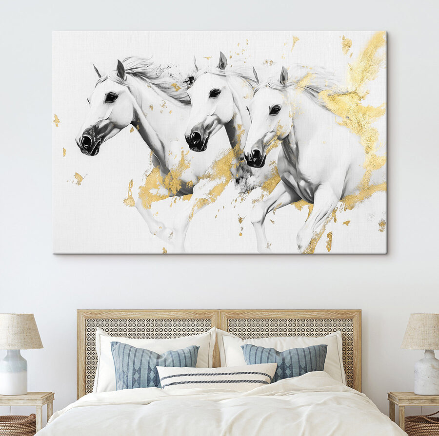 Bringen Sie einen Hauch von wilder Eleganz in jeden Raum mit diesem eindrucksvollen Leinwanddruck, der eine Gruppe weißer Pferde in vollem Galopp zeigt. Es ist, als hätten Sie Ihr eigenes Wildwest-Abenteuer direkt an der Wand! Stellen Sie sich die Energie vor, die diese anmutigen Kreaturen mit ihren wallenden Mähnen ausstrahlen, perfekt eingefangen mitten im Schritt. Dieses Kunstwerk dekoriert nicht nur, es lädt auch zu Geschichten und Tagträumen ein. Perfekt für ein Wohnzimmer, ein Büro oder eine gemütliche Leseecke – die Gäste könnten sich inspiriert fühlen, aufzusatteln und in ihre eigene Fantasie zu reiten! Ob Sie ein Pferdeliebhaber sind oder einfach nur jemand, der die Schönheit der Natur zu schätzen weiß, dieses Stück wird mit Sicherheit für Freude und Unterhaltung sorgen. Warten Sie nur auf die Komplimente, die Sie bekommen werden!