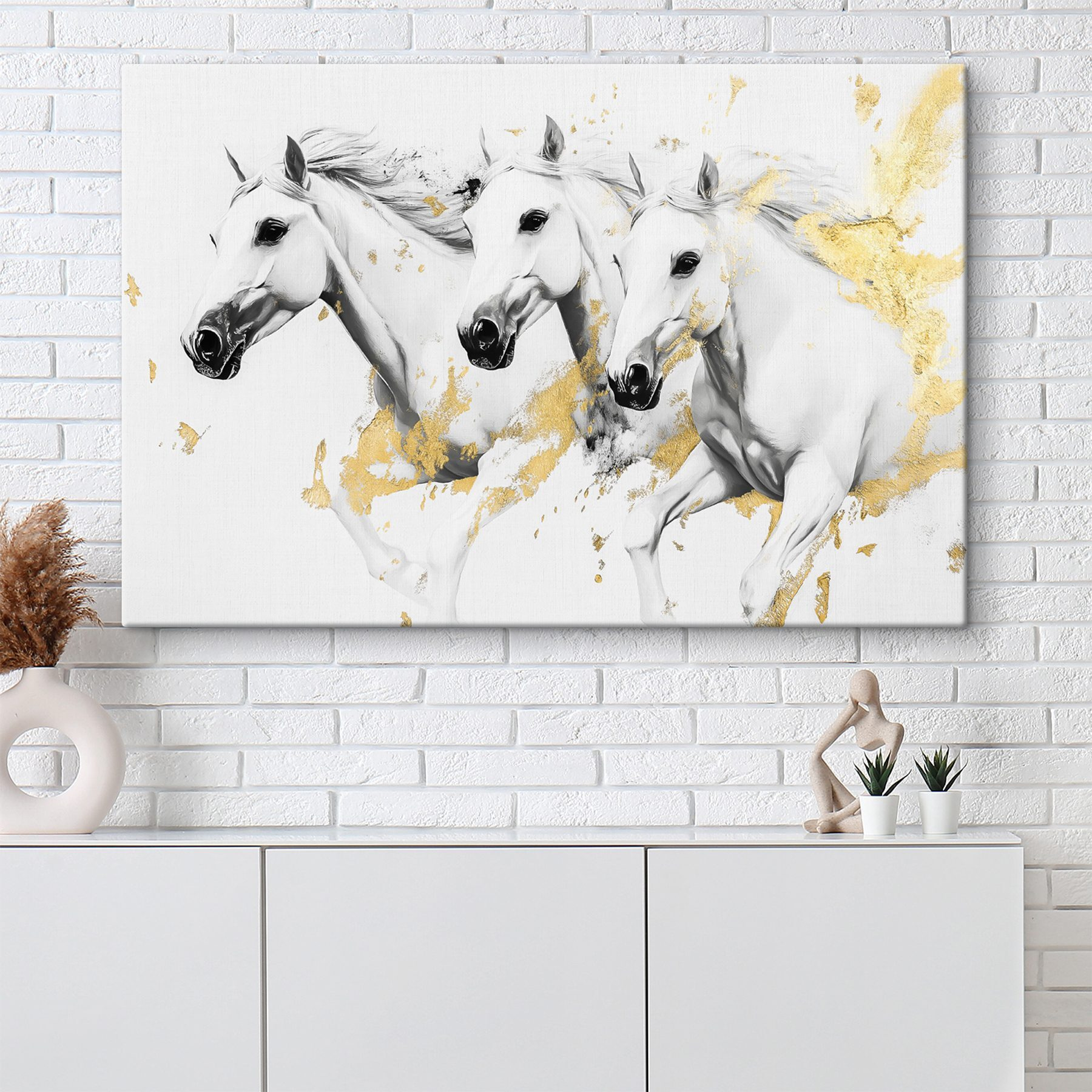 Bringen Sie einen Hauch von wilder Eleganz in jeden Raum mit diesem eindrucksvollen Leinwanddruck, der eine Gruppe weißer Pferde in vollem Galopp zeigt. Es ist, als hätten Sie Ihr eigenes Wildwest-Abenteuer direkt an der Wand! Stellen Sie sich die Energie vor, die diese anmutigen Kreaturen mit ihren wallenden Mähnen ausstrahlen, perfekt eingefangen mitten im Schritt. Dieses Kunstwerk dekoriert nicht nur, es lädt auch zu Geschichten und Tagträumen ein. Perfekt für ein Wohnzimmer, ein Büro oder eine gemütliche Leseecke – die Gäste könnten sich inspiriert fühlen, aufzusatteln und in ihre eigene Fantasie zu reiten! Ob Sie ein Pferdeliebhaber sind oder einfach nur jemand, der die Schönheit der Natur zu schätzen weiß, dieses Stück wird mit Sicherheit für Freude und Unterhaltung sorgen. Warten Sie nur auf die Komplimente, die Sie bekommen werden!