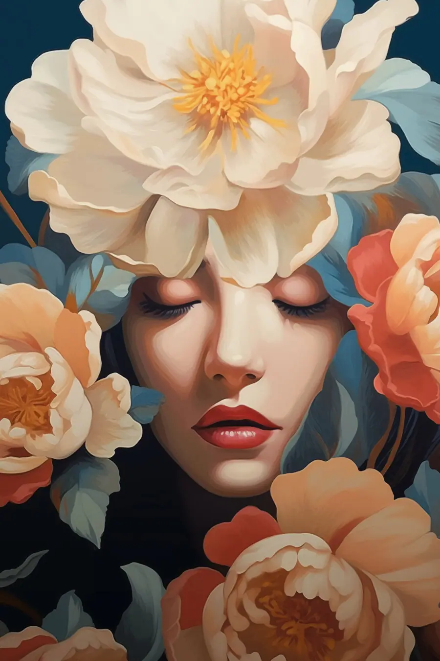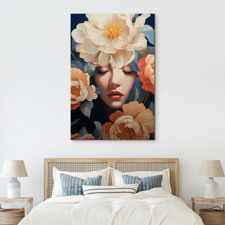 Lernen Sie “Woman with Flowers Around Her Head” kennen, ein Leinwandbild, das wie ein Hauch von frischer Frühlingsluft für Ihren Raum ist. Stellen Sie sich vor, Sie betreten einen Raum und werden von dieser heiteren Schönheit begrüßt, deren weiche Gesichtszüge von leuchtenden Blüten umrahmt werden. Es ist, als würde sie Sie dazu einladen, langsamer zu werden und sich an den kleinen Dingen zu erfreuen.