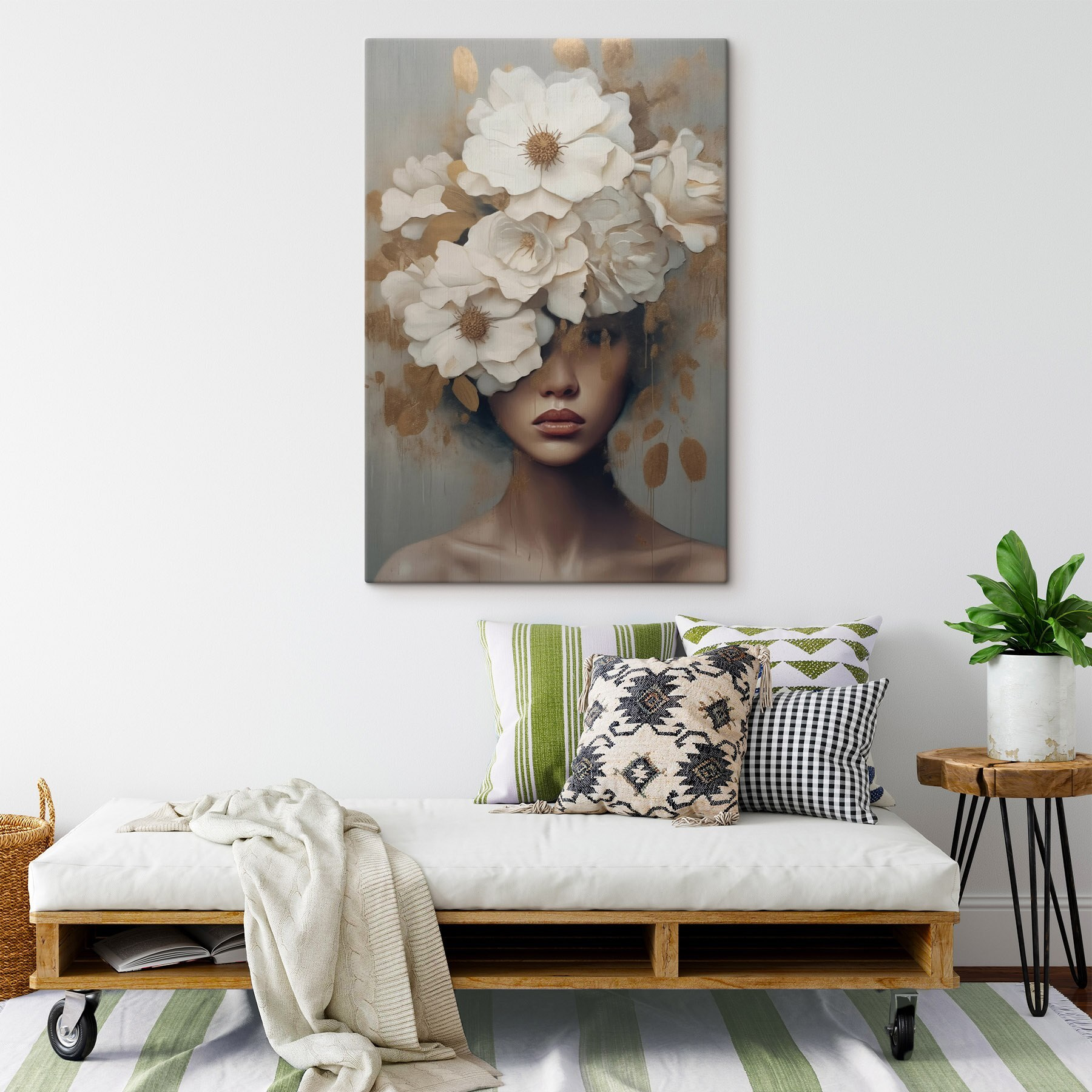 Verwandeln Sie Ihren Raum mit diesem bezaubernden Leinwanddruck, der eine mit üppigen Blumen geschmückte Frau zeigt. Es ist, als ob Sie sich frischen Wind in Ihr Wohnzimmer holen würden. Stellen Sie sich vor: Sie lassen sich nach einem langen Tag auf Ihre Couch fallen, und dieses lebendige Bild stiehlt Ihnen mühelos die Show. Die sanften Striche und atemberaubenden Blüten flüstern Geschichten von Natur, Wärme und Schönheit und inspirieren zu Tagträumen von sonnenbeschienenen Gärten. Es eignet sich perfekt, um Gespräche anzuregen oder einfach nur, um jeder Wand einen Hauch von Persönlichkeit zu verleihen. Wer braucht schon einen Ausflug zum Floristen, wenn diese Schönheit nur einen Blick entfernt ist?