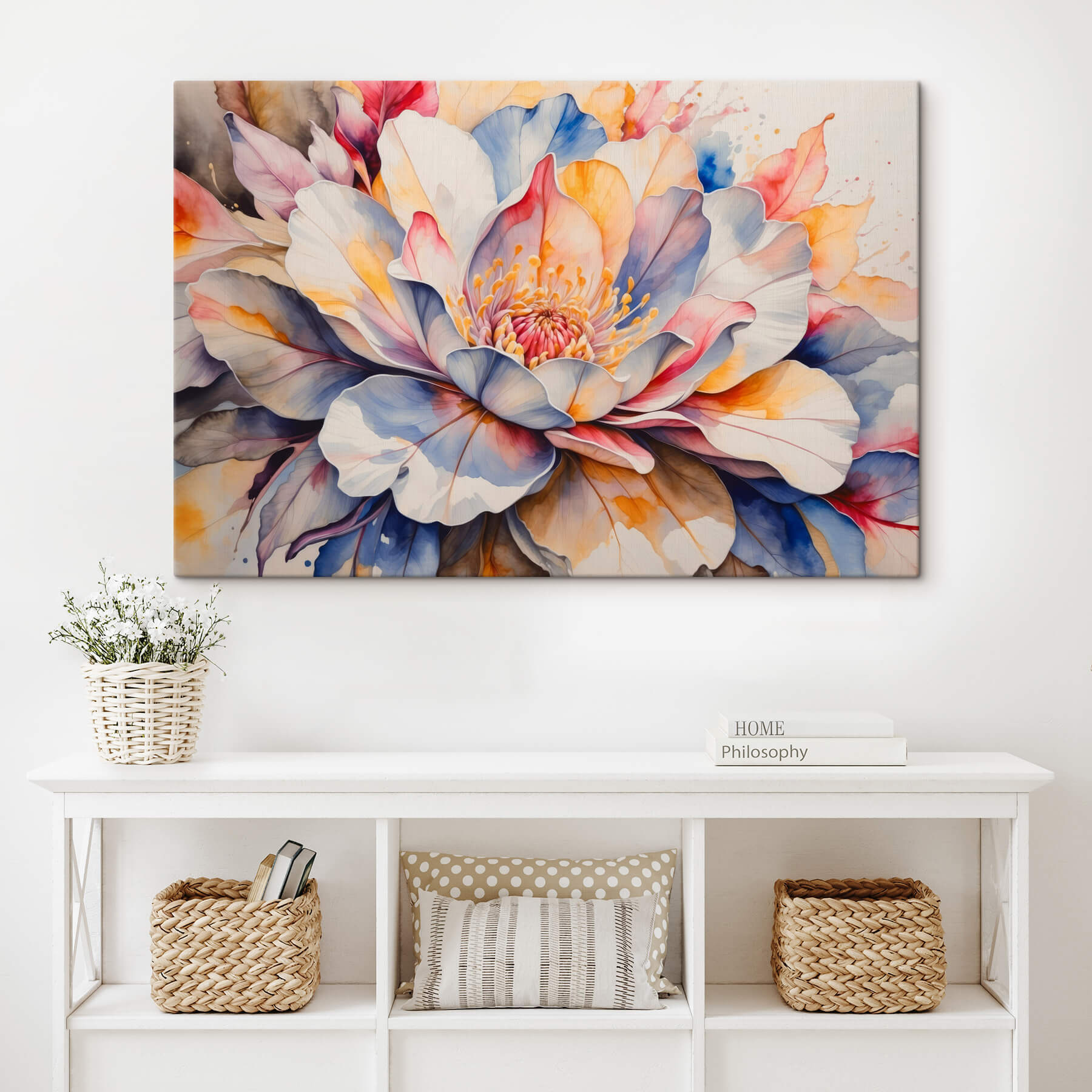 Verwandeln Sie Ihren Raum mit diesem atemberaubenden Leinwanddruck „Canvas Prints Painting of a Flower”. Es geht nicht nur um Farben, sondern auch um Gefühle. Stellen Sie sich vor, wie er Ihr Wohnzimmer erhellt oder dieser ruhigen Ecke einen Hauch von Freude verleiht. Die satten Blautöne und sanften Pastellfarben vermischen sich wie in einem Aquarelltraum und strahlen Ruhe und ein wenig Verspieltheit aus. Ihre Freunde werden Sie vielleicht sogar fragen, ob Sie auf magische Weise einen grünen Daumen bekommen haben. Und seien wir ehrlich, würden wir sie nicht alle gerne hereinlegen? Perfekt für alle, die sich nach einem Hauch von Natur in ihren vier Wänden sehnen, ohne sich darum kümmern zu müssen – kein Gießen erforderlich!