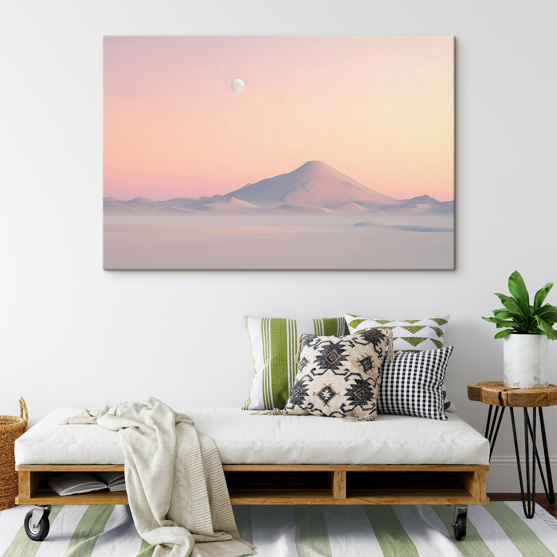 Verwandeln Sie Ihren Raum mit dem verträumten Leinwandbild “Snow Covered Mountain in a Desert”. Stellen Sie sich vor, Sie schlürfen Ihren Morgenkaffee, während Sie auf diese ruhige Landschaft blicken – ein wahrer Stimmungsaufheller! Die sanften Pastelltöne schaffen eine beruhigende Atmosphäre, die jeden Raum sofort entspannter wirken lässt, als wären Sie gerade in ein ruhiges Wüstenrefugium eingetreten.