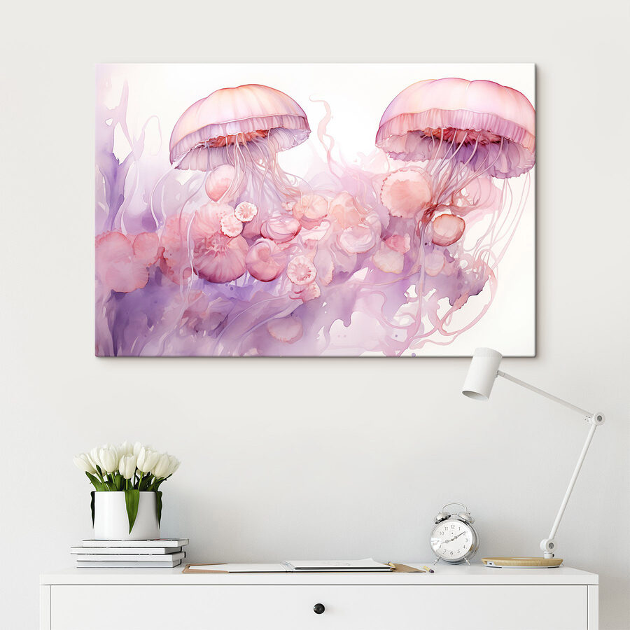 Tauchen Sie ein in eine verträumte Unterwasserwelt mit diesem atemberaubenden Leinwanddruck, der eine anmutige Gruppe von Quallen zeigt. Die sanften Pastellfarben tanzen miteinander und schaffen eine ruhige Atmosphäre, die sich wie eine sanfte Meeresbrise anfühlt. Stellen Sie sich vor, dieses Bild in einer gemütlichen Ecke oder über dem Sofa aufzuhängen – es wird mit Sicherheit für Gesprächsstoff sorgen! Freunde könnten sich dabei ertappen, wie sie gedankenverloren vor sich hinstarren, während sie sich das friedliche Wiegen von Quallen vorstellen, die durch das Meer treiben. Dieses Kunstwerk ist nicht nur Dekoration, es ist eine Flucht, ein Hauch von Gelassenheit, der jeden Raum erhellt. Perfekt für alle, die die Kunst des Ungewöhnlichen zu schätzen wissen!