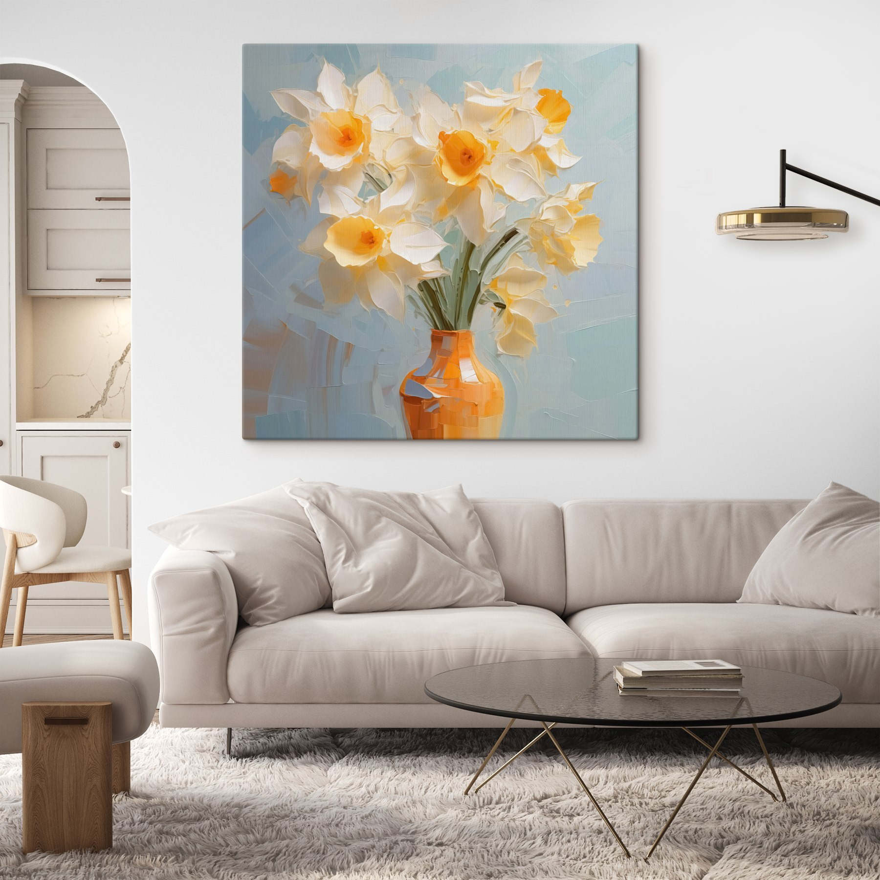 Verschönern Sie jeden Raum mit diesem entzückenden Leinwanddruck “Gelbe und weiße Blumen in einer Vase”. Stellen Sie sich vor, Sie betreten einen Raum, in dem die sanften Farben der frischen Blüten ein Lächeln auf Ihr Gesicht zaubern – wie ein sonniger Tag, der auf einer Leinwand festgehalten wurde. Der fröhliche Sonnenschein und die zarten Blütenblätter scheinen von den kommenden wärmeren Tagen zu erzählen. Es eignet sich perfekt für eine gemütliche Sitzecke, vielleicht zusammen mit einer dampfenden Tasse Kaffee oder einer Wochenendlektüre, die einen völlig in Anspruch nimmt. Im Ernst, es ist die Art von Kunst, die Komplimente macht und zu Gesprächen anregt. Ohne die Pollen, versteht sich!
