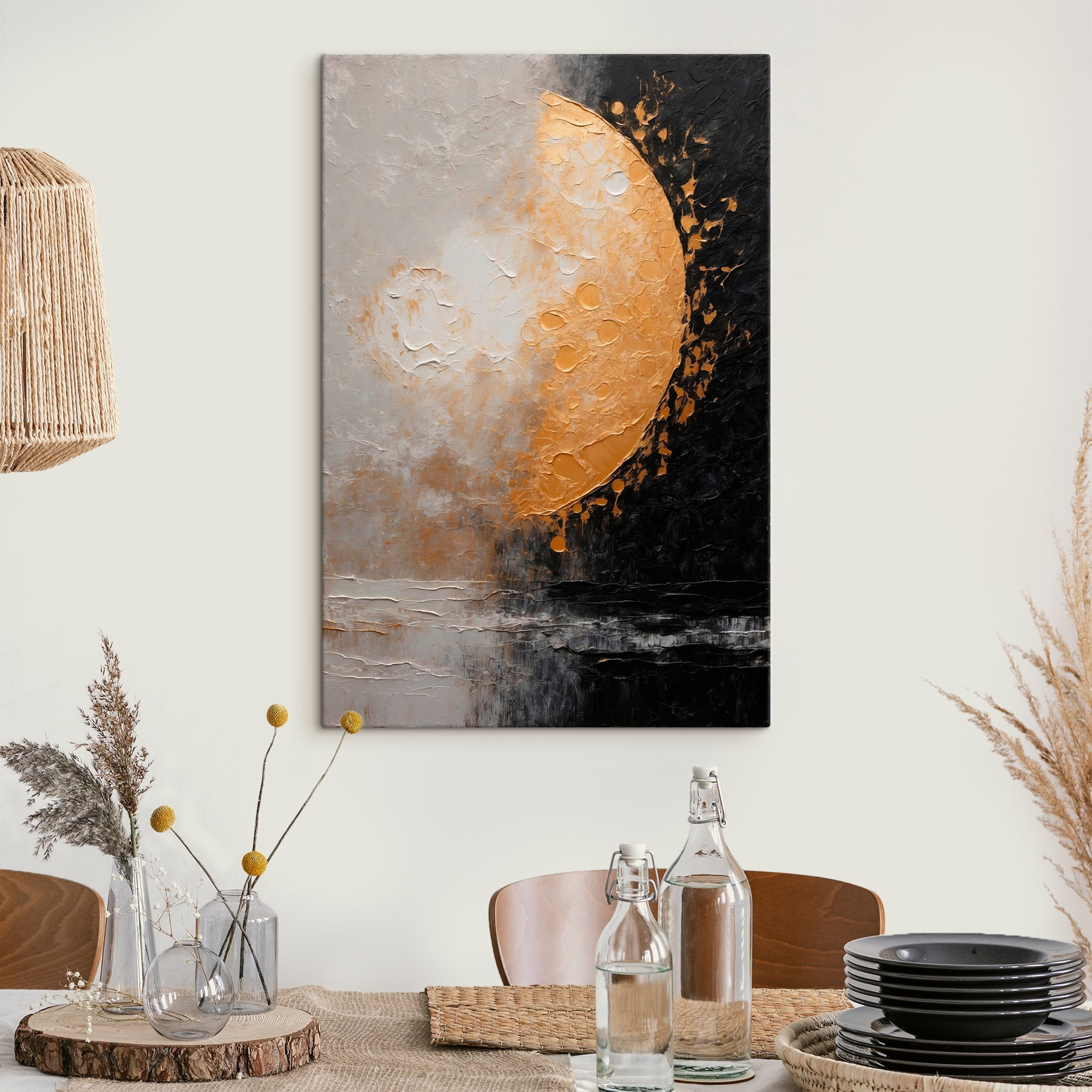 Verwandeln Sie Ihren Raum mit diesem atemberaubenden Leinwanddruck eines Mondes, bei dem Kunst und Universum aufeinandertreffen. Der Kontrast zwischen Hell und Dunkel schafft ein fesselndes Gleichgewicht, das die Blicke auf sich zieht und Neugierde weckt. Stellen Sie sich vor, wie Sie es sich mit einer Tasse Tee gemütlich machen und in Gedanken versunken sind, während dieses Bild einen Hauch von kosmischer Magie an Ihre Wände bringt. Es ist wie ein kleines Stück Nachthimmel, das in Reichweite hängt, perfekt für Tagträumer und Sternengucker. Lassen Sie dieses vom Mondlicht inspirierte Kunstwerk zum Gesprächsanlass werden oder einfach als beruhigende Kulisse für den Alltag dienen. Machen Sie sich das Wunder zu eigen!