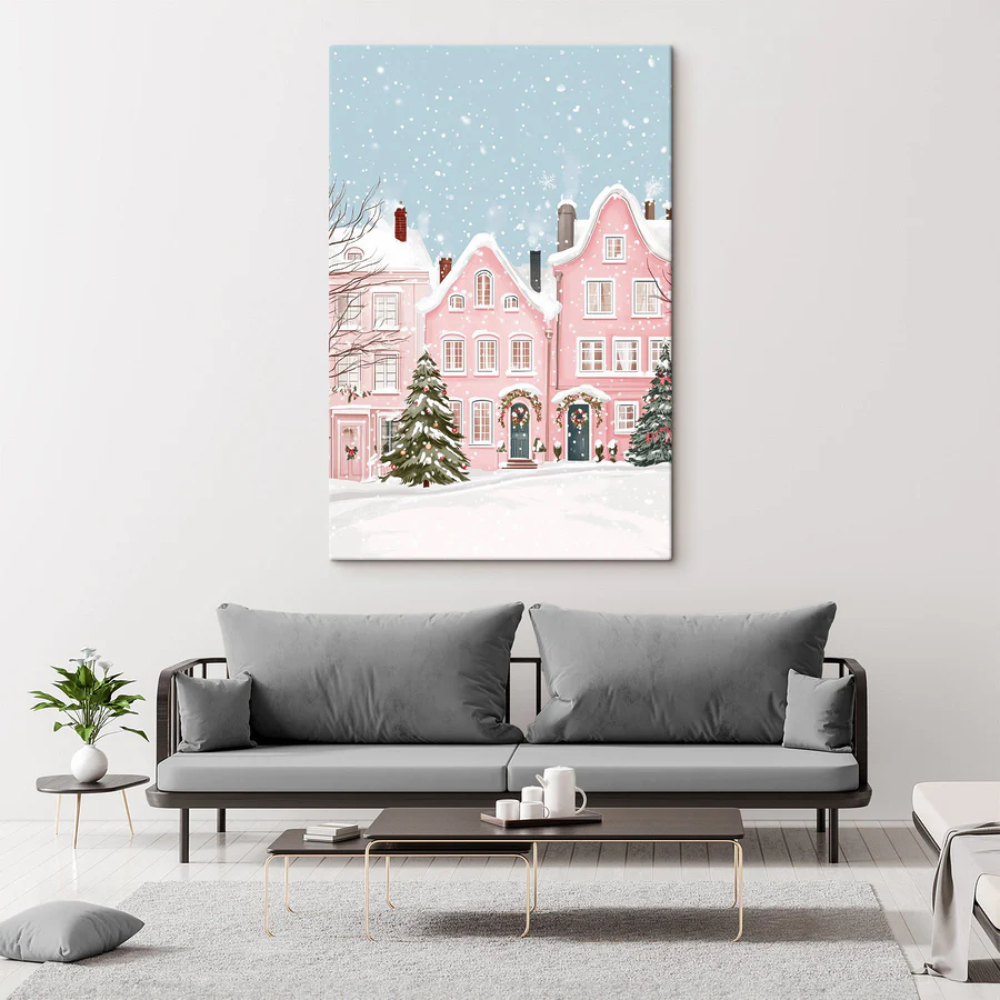 Verwandeln Sie jede Wand mit diesem bezaubernden Leinwanddruck „Pink House with Snow“. Stellen Sie sich vor: Sanfte Schneeflocken tanzen um gemütliche rosa Häuser und glitzern unter einem hellblauen Himmel. Es ist, als wäre ein Winterwunderland direkt in Ihr Wohnzimmer gezaubert worden! Die traumhafte Szene fängt die Magie der Jahreszeit ein und weckt warme Erinnerungen an heiße Schokolade und fröhliches Lachen mit Freunden. Ob als festlicher Hintergrund für die Feiertage oder einfach als schöne Erinnerung an die Schönheit des Winters – dieser Druck verleiht jedem Raum eine fröhliche, gemütliche Atmosphäre. Hängen Sie ihn auf und lassen Sie die Magie wirken!