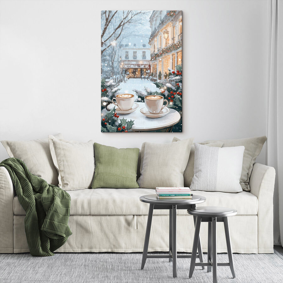 Verleihen Sie jedem Raum eine gemütliche Atmosphäre mit diesem charmanten Leinwanddruck, der zwei Tassen Kaffee auf einem Tisch zeigt, umrahmt von einer verschneiten Straße. Es ist wie eine Szene aus einem Weihnachtsfilm, die Sie dazu einlädt, sich das leise Geräusch von fallendem Schnee und den köstlichen Duft von frischem Kaffee in der Luft vorzustellen. Stellen Sie sich vor, wie Sie sich in Ihre Lieblingsdecke kuscheln und den ersten Schluck genießen, während die Welt draußen funkelt. Dieser Druck ist perfekt für alle, die einen Hauch von Wärme in ihrer Einrichtung lieben. Er fängt einen Moment einfacher Freude ein und ist eine reizvolle Ergänzung für jedes Zuhause. Es ist Kunst, die nicht nur das Auge erfreut, sondern auch das Herz berührt. Perfekt für Kaffeeliebhaber oder alle, die eine winterliche Auszeit brauchen.