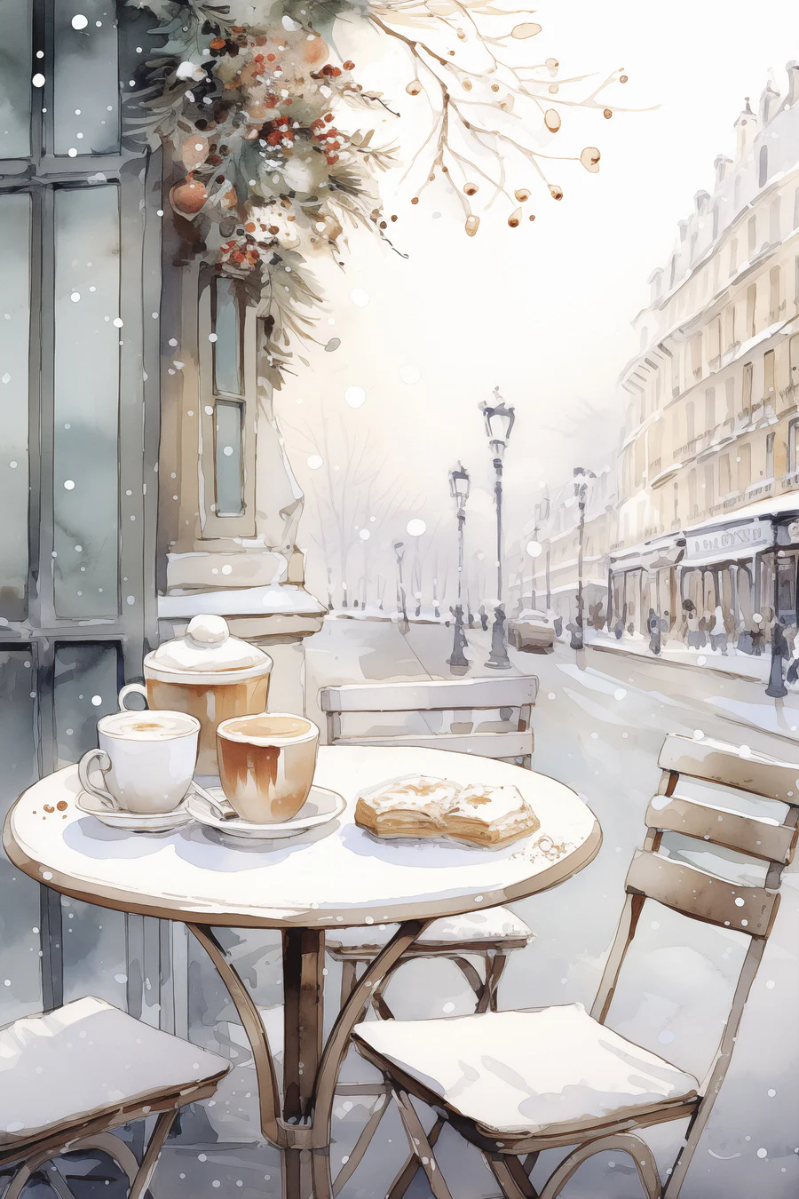 Stellen Sie sich vor, Sie schlürfen Ihren Morgenkaffee in einem gemütlichen Café, während draußen sanft der Schnee fällt und flockige Croissants auf dem Tisch locken. Dieser Leinwanddruck fängt genau diesen Moment ein – perfekt für alle, die gutes Essen und warme Momente zu schätzen wissen. Es ist wie ein kleines Fenster zu einer Winterszene, die zu Tagträumen und gemütlichen Momenten einlädt. Hängen Sie es in der Küche auf, und es ist fast so, als würde der Duft von frischem Gebäck den Raum erfüllen und jeden Morgen zu etwas Besonderem machen. Es ist nicht nur Kunst, sondern ein Erlebnis, das Ihren Raum erhellt und Ihre Geschmacksknospen zum Kribbeln bringt.