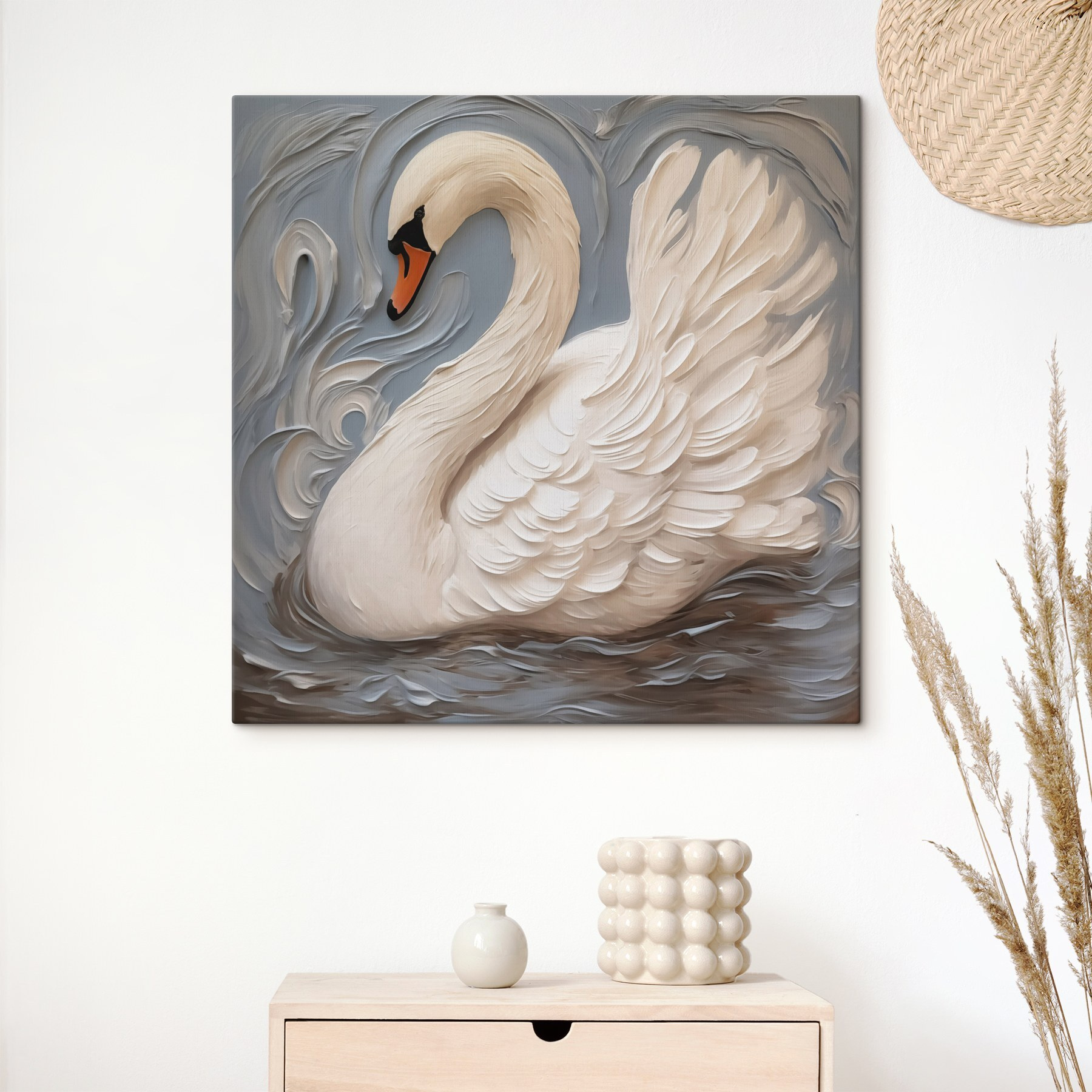 Verwandeln Sie jeden Raum mit diesem bezaubernden Leinwanddruck eines weißen Schwans mit einem schicken schwarzen Schnabel. Es ist, als hätten Sie ein Stück Natur direkt an Ihrer Wand, das mühelos einen Hauch von Eleganz verleiht. Die sanften Wellen um den Schwan herum vermitteln ein Gefühl der Ruhe und machen ihn perfekt für gemütliche Abende oder wenn Sie einfach nur einen Moment zum Entspannen brauchen. Stellen Sie sich vor, Sie stehen in Ihrem Wohnzimmer, eine Tasse Tee in der Hand, und spüren, wie diese friedliche Atmosphäre Sie umgibt. Es ist nicht nur Kunst, sondern ein kleines Stück Ruhe, das zu Gesprächen und Bewunderung einlädt. Perfekt für alle, die die Schönheit der Einfachheit schätzen – ernsthaft, was gibt es daran nicht zu lieben?