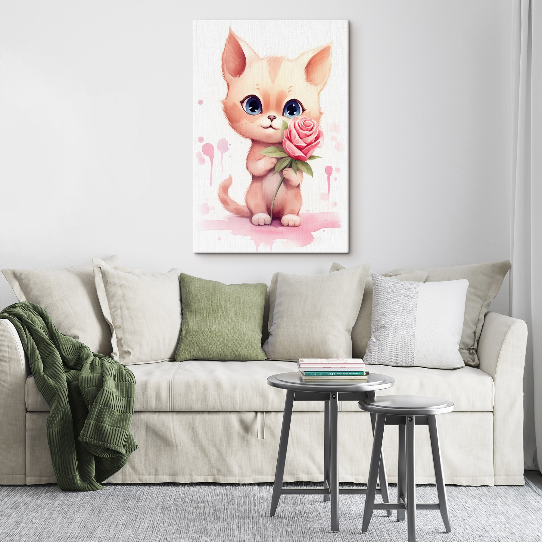 Wir präsentieren einen entzückenden Leinwanddruck: eine charmante kleine Katze, die eine strahlende Blume hält und bereit ist, jedem Raum einen Hauch von Freude und Verspieltheit zu verleihen. Stellen Sie sich dieses süße Tierchen an Ihrer Wand vor, das Wärme und einen Hauch von Verspieltheit ausstrahlt. Es ist, als hätten Sie einen pelzigen Freund, der Sie immer aufmuntern kann – ganz ohne Katzentoilette! Die leuchtenden Farben zaubern ein Lächeln auf Ihr Gesicht, während der sanfte, süße Ausdruck Ihr Herz erobert. Perfekt für gemütliche Ecken oder um einen tristen Flur aufzuhellen. Hängen Sie ihn an einer Stelle auf, wo Sie ihn täglich sehen, und lassen Sie ihn ein wenig Freude in Ihren Alltag bringen. Schmücken Sie Ihr Zuhause mit diesem bezaubernden Kunstwerk und freuen Sie sich über die vielen Lächeln, die es hervorruft!
