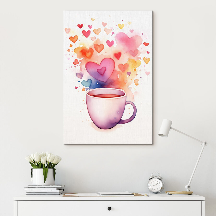 Verschönern Sie Ihren Raum mit diesem bezaubernden Leinwanddruck, der treffend „Cup of Tea with Hearts” (Tasse Tee mit Herzen) heißt. Er ist wie eine warme Umarmung in Aquarellform! Stellen Sie sich vor, wie er an Ihrer Wand hängt und eine gemütliche Atmosphäre verbreitet, mit Herzen, die um eine hübsche Teetasse herumflattern. Jedes Mal, wenn Sie morgens Ihre Tasse Tee genießen, werden Sie an die einfachen Freuden des Lebens erinnert – vielleicht an einen perfekten Regentag oder einen Moment in guter Gesellschaft. Es ist nicht nur Dekoration, sondern ein kleines Stück Glück für Ihr Zuhause. Mit seinen Farbtupfern und seiner sanften Verspieltheit bringt dieser Druck mühelos Liebe und Wärme in jeden Raum. Wer braucht nicht ein bisschen mehr Herz in seinem Leben?