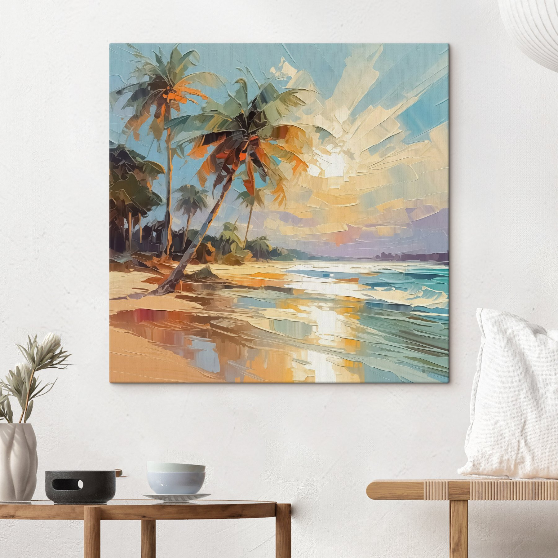 Stellen Sie sich vor, Sie betreten jedes Mal, wenn Sie an diesem atemberaubenden Leinwanddruck vorbeigehen, ein sonnendurchflutetes Paradies. Dieses Gemälde eines Strandes mit wiegenden Palmen fängt nicht nur eine Szene ein, sondern eine ganze Stimmung – warme Sonne, Sand zwischen den Zehen und die erfrischende Meeresbrise, die selbst den mürrischsten Morgen in einen Strandtag verwandeln kann. Die leuchtenden Farben tanzen über die Leinwand und lassen jede langweilige Wand wie im Urlaub wirken. Perfekt für Wohnzimmer oder gemütliche Ecken, ist es, als hätte man das ganze Jahr über ein Stück Sommer. Schnappen Sie sich Ihre Sonnenbrille, lehnen Sie sich zurück und lassen Sie Ihre Sorgen mit der Flut davontreiben. Wer braucht schon ein Flugticket, oder?