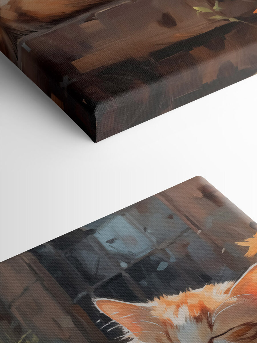 Stellen Sie sich einen sonnigen Nachmittag vor, an dem die Welt draußen einfach etwas langsamer wird. Dieser Leinwanddruck „Katze auf einem Sims liegend“ fängt diese entspannte Stimmung perfekt ein. Mit ihrem weichen orangefarbenen Fell und ihrem Ausdruck purer Zufriedenheit sieht diese Katze aus, als träume sie davon, Schmetterlingen hinterherzujagen oder vielleicht ihren nächsten Snack-Raub zu planen. Das üppige Grün und das warme Sonnenlicht bringen fröhliche Akzente in jeden Raum und sorgen für eine gemütliche und einladende Atmosphäre. Hängen Sie ihn in Ihrem Wohnzimmer auf, und es ist, als würden Sie einen flauschigen Freund willkommen heißen, der immer weiß, wie man genau richtig ein Nickerchen macht. Es ist die Art von Kunst, die Sie zum Lächeln bringt – wie eine sanfte Erinnerung daran, sich einen Moment Zeit zu nehmen und einfach nur zu atmen. Und wer liebt nicht eine Katze, die so entspannt aussieht?